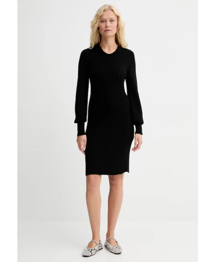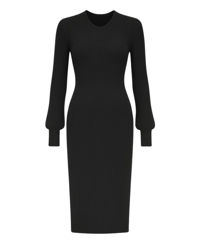 Это платье-двойка из тонкой ребристой вязки сочетает в себе сдержанную элегантность и изысканный комфорт. Ребристая вязка мягко формирует силуэт, делая его подходящим как для повседневного шика, так и для утонченных вечерних образов. Ключевые особенности: Черный | Тонкая ребристая вязка | Эластичная ткань | Круглый вырез | Длинные рукава с высокими манжетами | Прямой силуэт до колена | Тонкая ребристая текстура | Размеры и посадка: Приталенный, но удобный крой