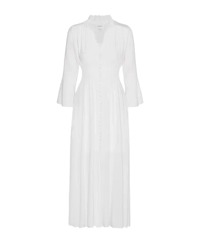 Откройте для себя элегантность платья Sally от AMERICANDREAMS - шикарного платья макси, излучающего непринужденный стиль благодаря присборенной талии и вырезу спереди. Ключевые особенности: Белый | Вискоза | Присборенная талия | Вырез спереди | Широкие рукава 3/4 | Застежка на пуговицы спереди | Волан по низу | Посадка и размер: Стандартный крой | Состав и уход: 100% вискоза | Машинная стирка в холодной воде, сушка в барабане при низкой температуре
