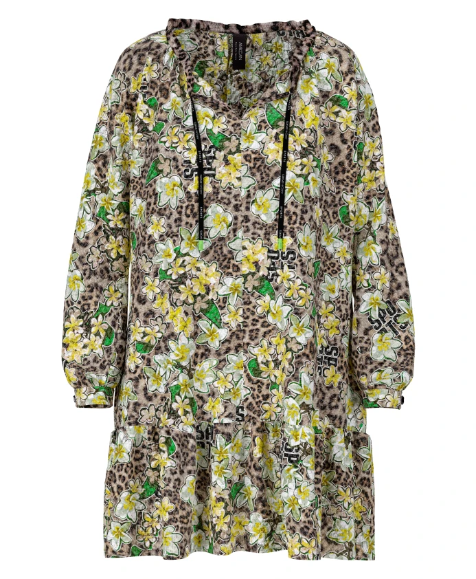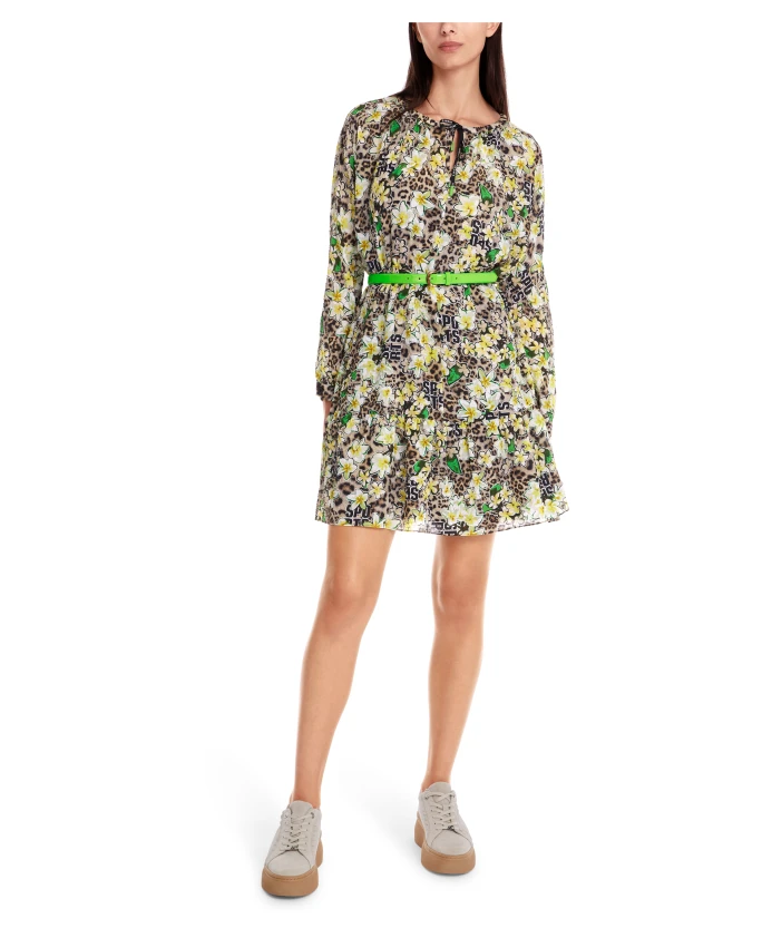 Мини-платье Marc Cain 'Rethink Together' с принтом. Изготовленное из мягкой, струящейся ткани, это платье имеет свободный силуэт кимоно с глубоким вырезом. Вырез регулируется шнурком. Принт представляет собой коллаж из стилизованных цветов, леопардового принта и текста. В комплект входит платье-комбинация. Идеально подходит для отдыха и отпуска. Изготовлено из 100% полиэстера. Рост модели 179 см, размер N3/38.