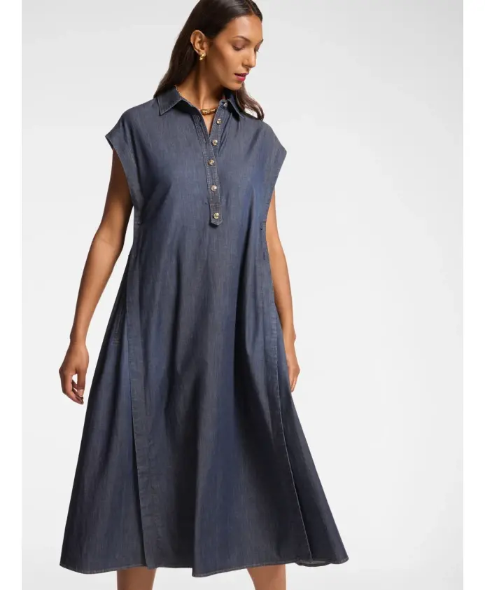 Описание товара: - Расклешенное платье из шамбре, идеально подходящее для летних дней - Воротник, вертикальная застежка спереди на пуговицы, прострочка по швам - Расклешенный силуэт, свежий и легкий. Состав и уход: - Основная ткань: 98% хлопок, 2% эластан - Бережная стирка при 40 градусах; не сушить в сушильной машине; не отбеливать; только химчистка; не гладить при высокой температуре (макс. 110°C)