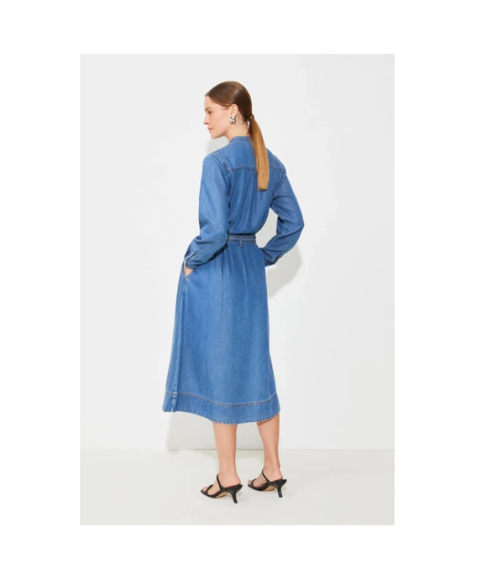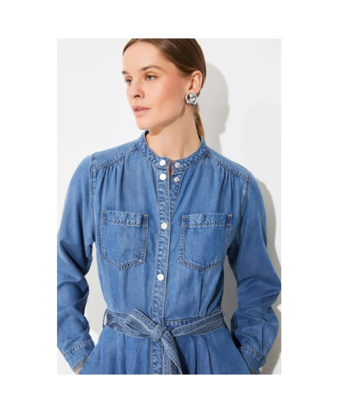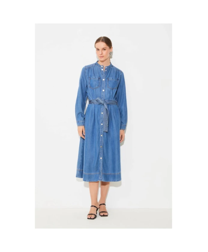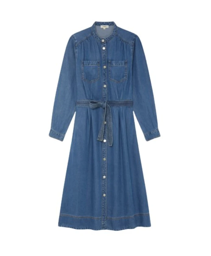 Это джинсовое платье миди от Suncoo с застежкой на пуговицы по всей длине создает современный, но вневременной стиль. Оно имеет два боковых кармана и два практичных нагрудных кармана, а также съемный пояс в тон, подчеркивающий талию. Длинные рукава с манжетами на пуговицах добавляют элегантности. Идеально подходит для шикарного и повседневного образа. Состав: 100% лиоцелл, сертифицированный FSC.