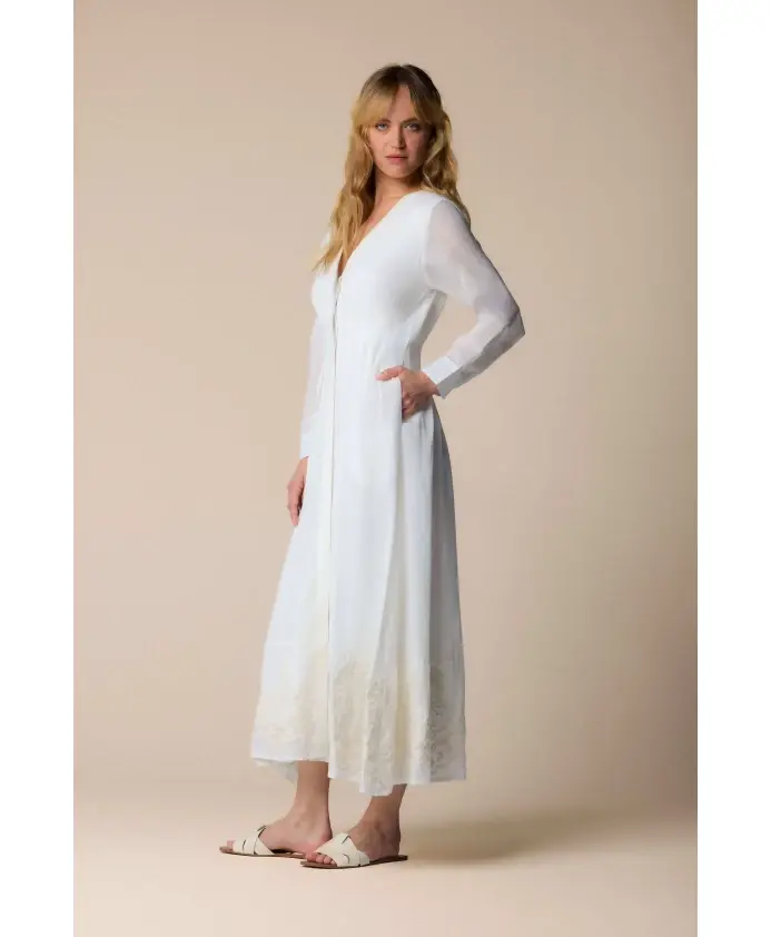 Откройте для себя элегантность ванильного платья Kocca с V-образным вырезом, изысканными кружевными деталями и манжетами на пуговицах, идеально подходящего как для повседневных прогулок, так и для особых случаев. Ключевые особенности: Цвет: масляный - ванильный | Белый | V-образный вырез | Длинные рукава | Кружевная отделка по низу | Манжеты на пуговицах | Размеры и посадка: стандартный крой