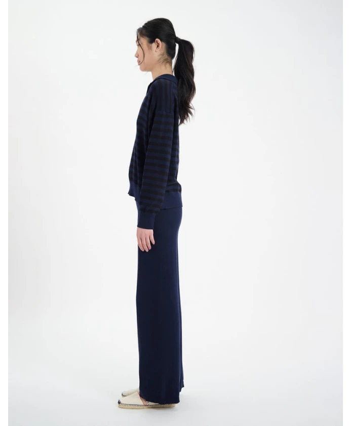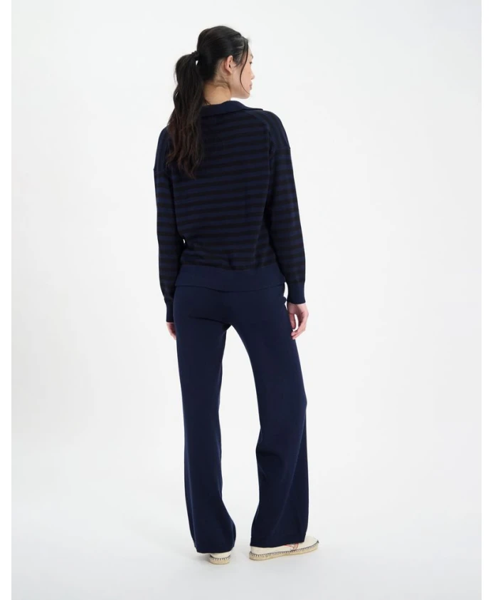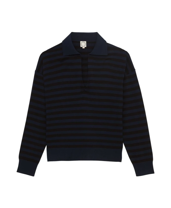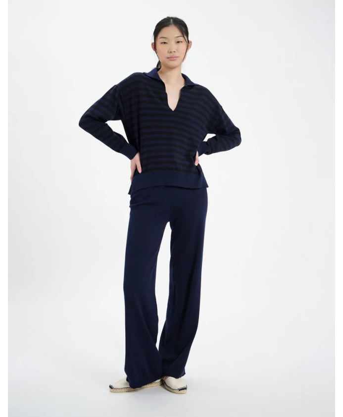 Благодаря элегантному воротнику-поло, длинным рукавам и свободному крою, свитер Teo согреет вас прохладными весенними вечерами. Этот полосатый свитер из 100% хлопка - классика, которую можно взять с собой в отпуск. Для создания превосходного и комфортного ансамбля вы также можете приобрести подходящие брюки John. Брюки John: прямой крой, эластичный пояс на шнурке, разработаны в Париже.