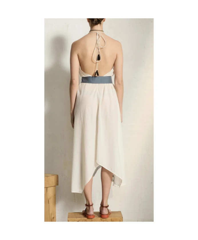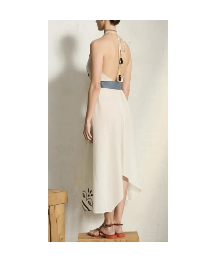 Платье IVINA ARABESQUE WHITE от MARE DI LATTE. Длинное платье с открытой спиной из хлопкового вуаля - культовая модель бренда. Регулируемый вырез с кисточками. Асимметричный крой, позволяющий создавать различные образы. Пояс продается отдельно. Принт «Арабеск». Состав: 100% хлопок. Цвет: белый.