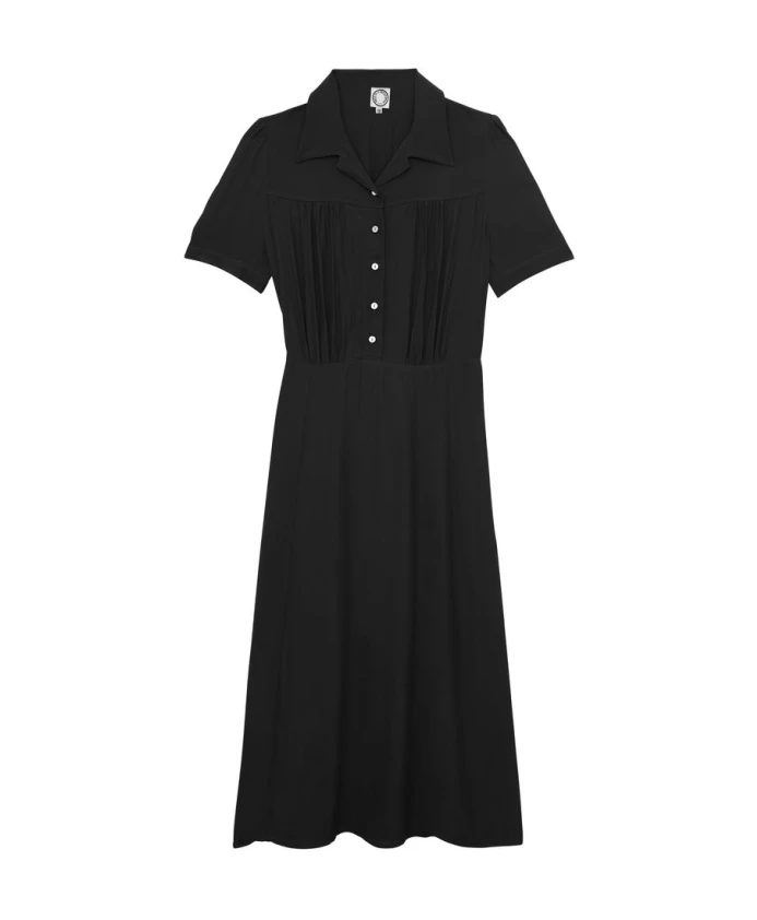 Платье Angèle обладает всеми качествами идеального летнего платья: оно легко надевается и гарантированно элегантно в любой ситуации. Здесь оно представлено в превосходной, роскошной ткани из 100% льна глубокого черного цвета. Платье Madeleine, А-силуэт, длина до колена, вырез-лодочка, потайная застежка по центру спины, без рукавов. Разработано в Париже. Сделано в Европе.