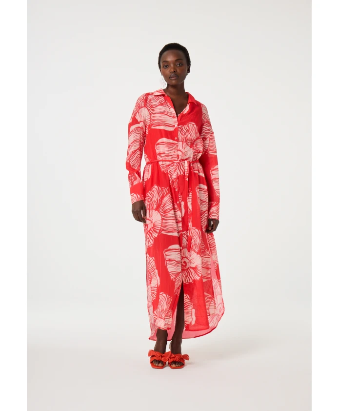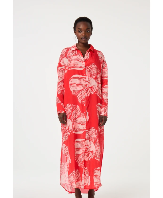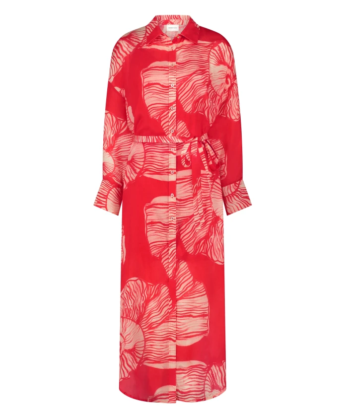Это длинное красное платье с нежным принтом в виде ракушек имеет струящийся силуэт и невероятно комфортно в ношении благодаря мягкой смеси вискозы и органического хлопка. Регулируемый пояс на талии обеспечивает удобную посадку. Сочетайте его с кроссовками для расслабленного летнего дня в городе или с туфлями на каблуках для более элегантного образа.