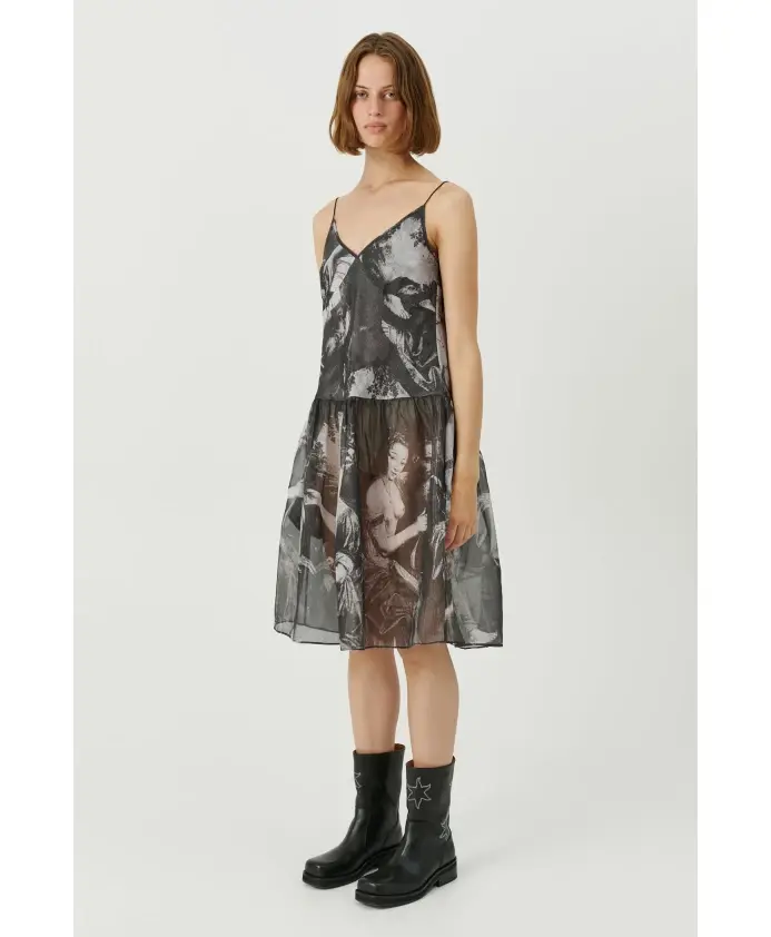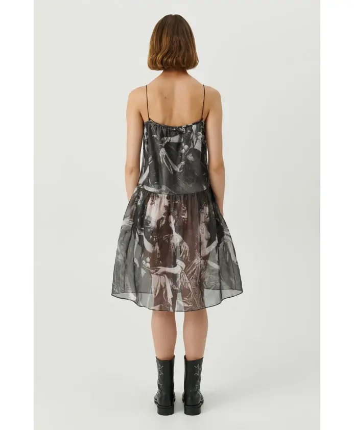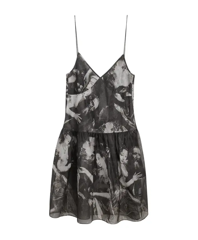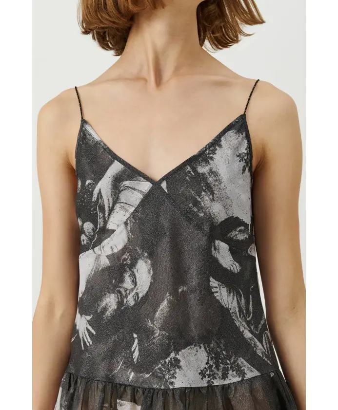 Платье «Таня» - это платье миди с регулируемыми бретелями и пышной юбкой. Изготовлено из полупрозрачной шелковой органзы с принтом. 100% шелк. Ткань поставляется из Китая. Изделие произведено в Китае. Тканевая этикетка изготовлена из полиэстера, сертифицированного по стандарту Oeko-Tex. Ярлыки изготовлены из бумаги, сертифицированной FSC.