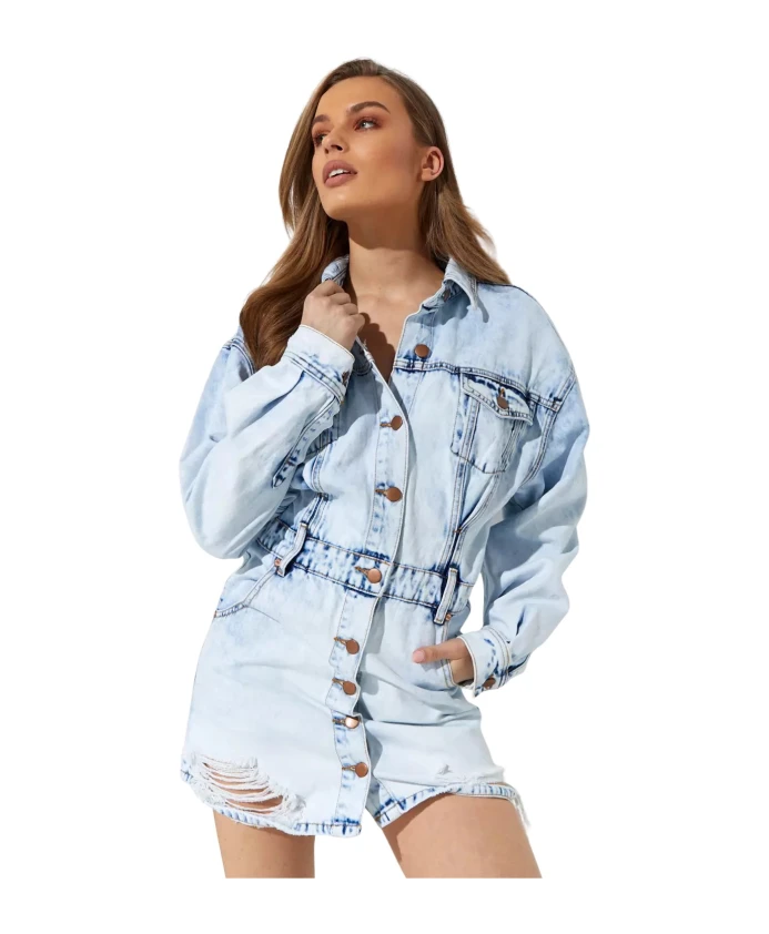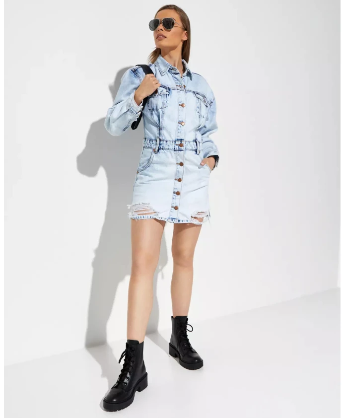Подчеркните свой повседневный стиль с помощью этого мини-платья из джинсовой ткани от One Teaspoon. Платье-рубашка, сшитое из светло-голубой джинсовой ткани, имеет застежку на пуговицы спереди, круглый вырез горловины, петли для пояса, длинные рукава с манжетами и воротник. Изготовлено из 100% хлопка.