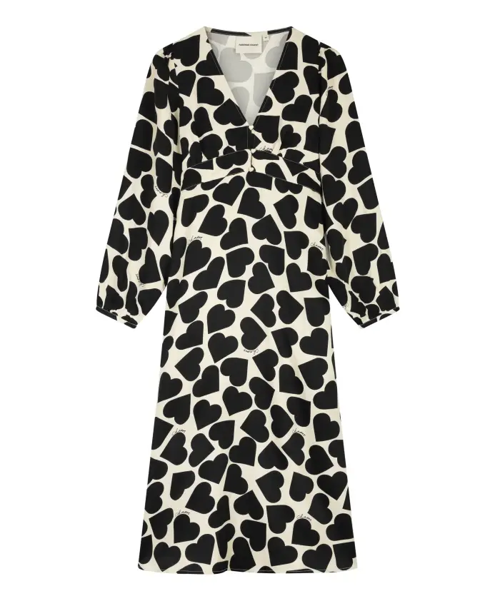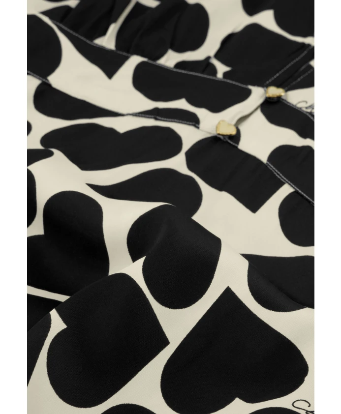 Это белоснежное платье украшено принтом в виде черных сердечек, создающим очаровательный и игривый образ. Платье имеет легкую драпировку и приятное струящееся полотно. Сочетайте его с простыми балетками для повседневного образа или с туфлями на высоком каблуке для более праздничного наряда.