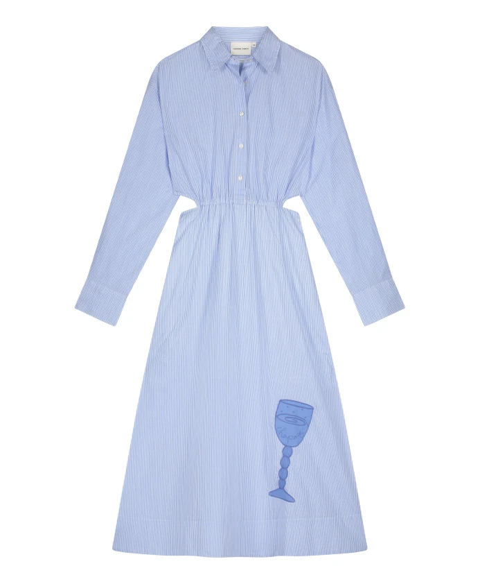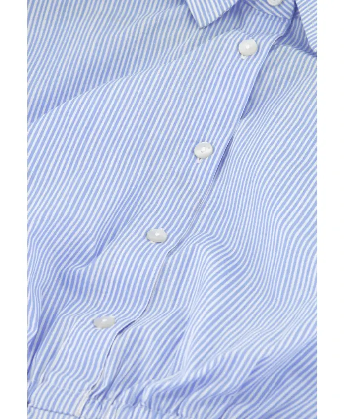 Это светло-голубое платье-рубашка в белую полоску - незаменимый элемент вашего гардероба. Изготовленное из 100% органического хлопка, оно впечатляет игривыми деталями, такими как изящные вырезы и съемный цветок. Сочетайте его с кроссовками для создания классического повседневного образа.