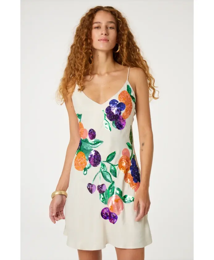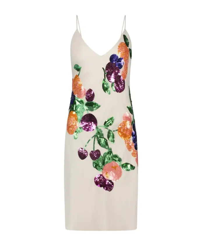 Это белое платье с тонкими бретелями и сверкающими фруктовыми аппликациями идеально подойдет для летней вечеринки или элегантного ужина. Изготовленное из 100% вискозы, оно дышащее и комфортное в носке. Дополните образ туфлями на высоком каблуке для элегантного завершения.