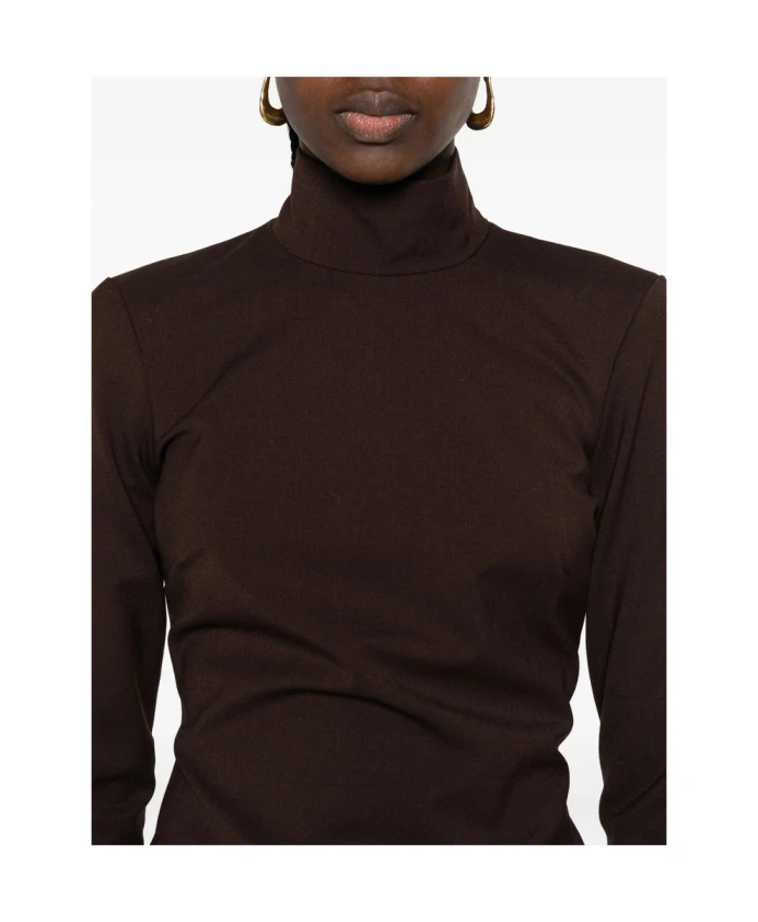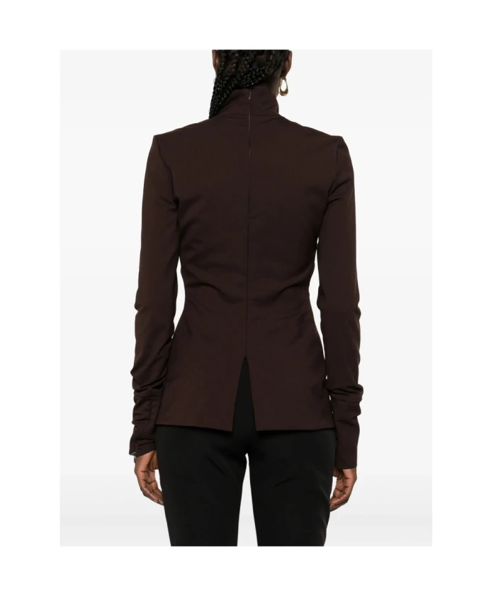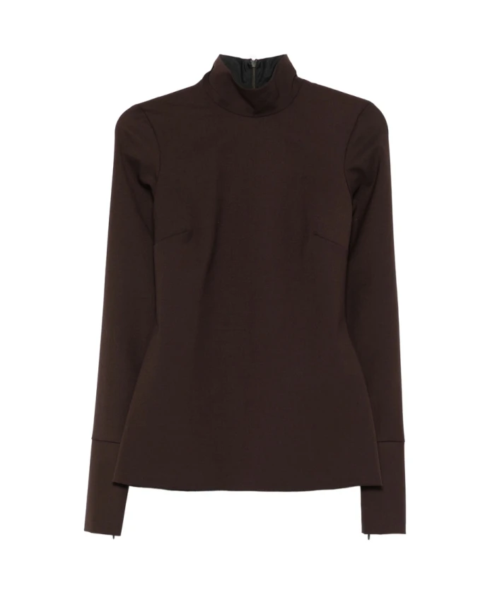 Обновите свой гардероб с помощью этой стильной коричневой блузки с высоким воротником от TheLatest. Она имеет длинные рукава, потайную застежку-молнию и прямой низ. Изготовлена из смеси полиэстера (53%), натуральной шерсти (44%) и эластана (4%).