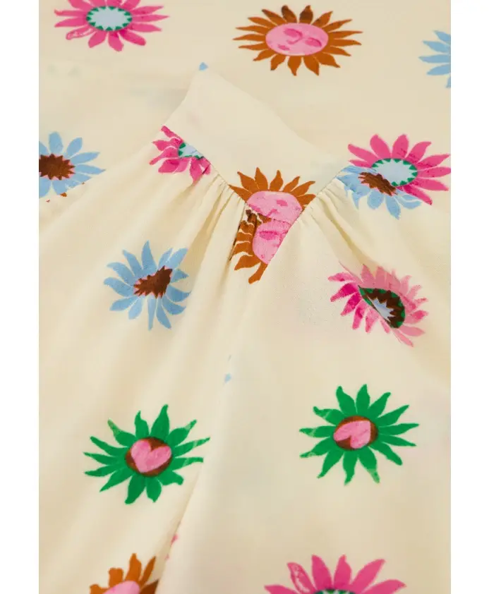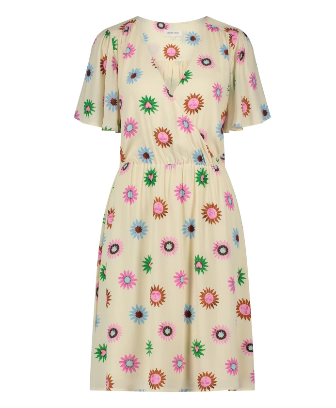 Это струящееся платье украшено принтом в виде солнечных лучей по всей поверхности, имеет небольшой V-образный вырез и короткие рукава. Приталенный крой создает привлекательный силуэт, что делает его идеальным выбором для повседневного стиля.