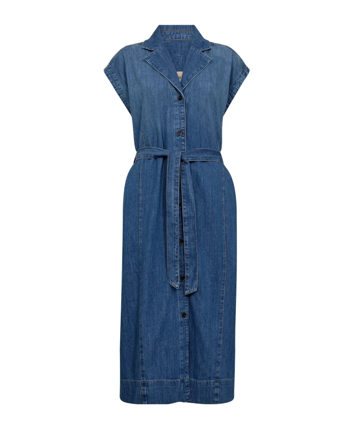 Элегантное джинсовое платье от Mos Mosh с короткими рукавами, красивым воротником и застежкой на пуговицы спереди. Платье также отличается выгодно подчеркивающим фигуру силуэтом, широким поясом на талии и роскошным качеством хлопка.