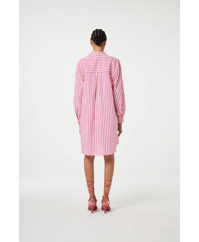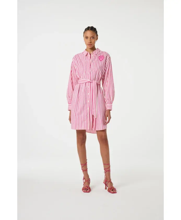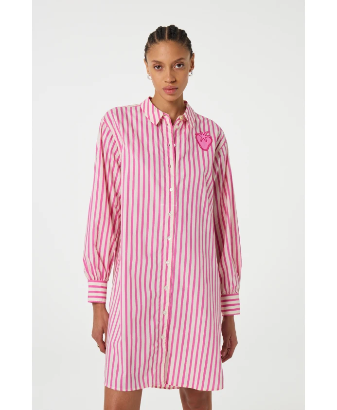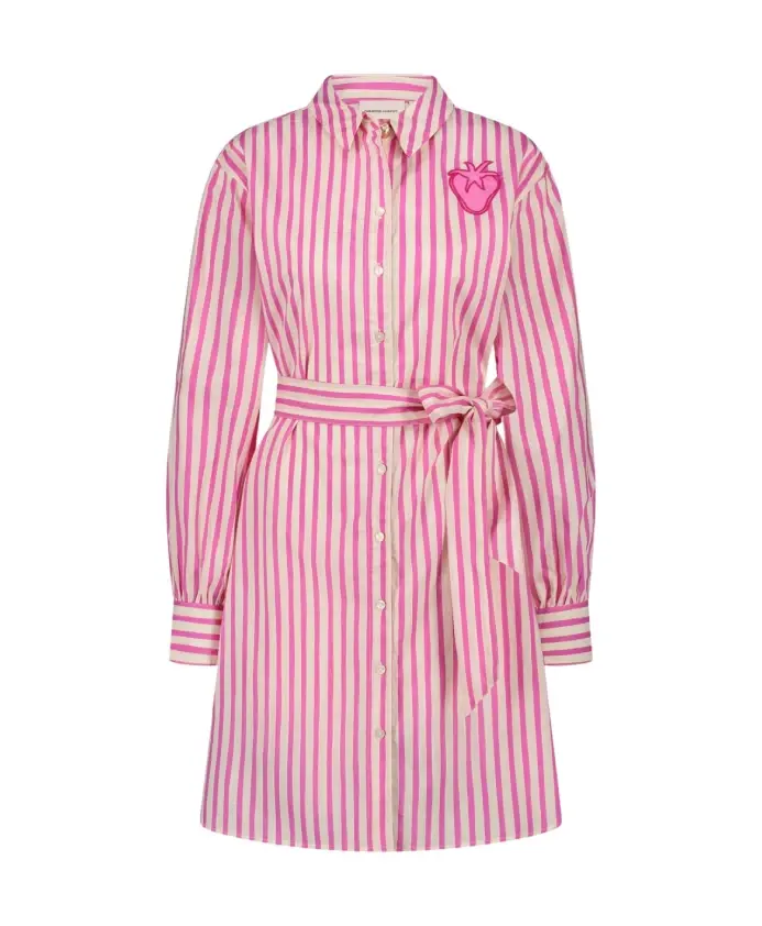 Это розовое полосатое платье-рубашка из 100% хлопка имеет пояс сбоку для создания привлекательного силуэта. Милая нашивка в виде клубники спереди добавляет игривости и делает его идеальным для солнечных дней.