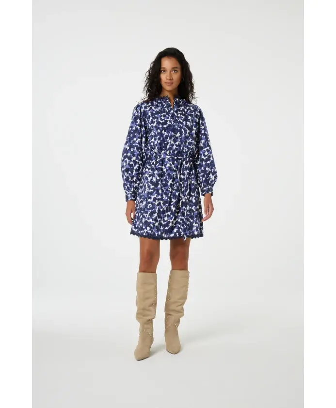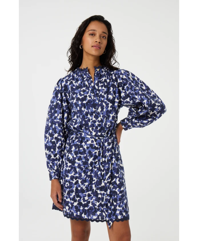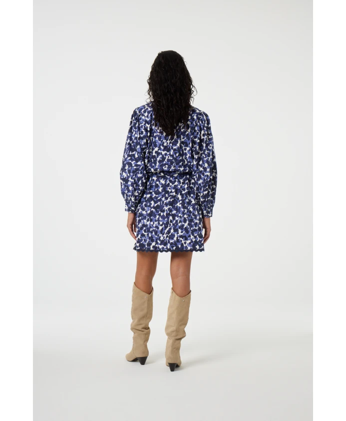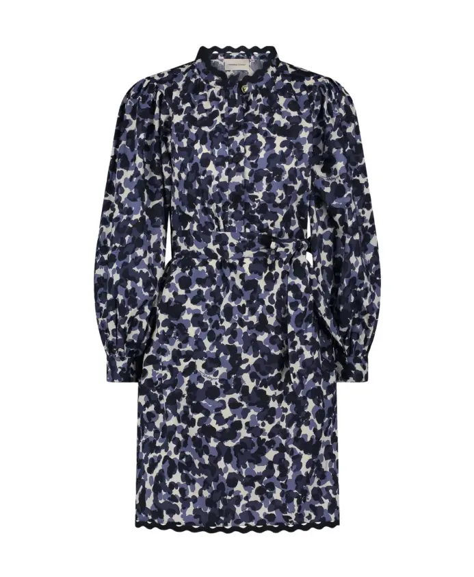 Это короткое платье с темно-синим принтом, длинными рукавами и стандартным кроем. Изготовлено из 100% хлопка, оно дышащее и комфортное - идеально подходит для повседневного образа без лишних усилий.