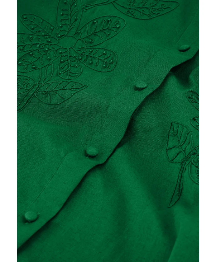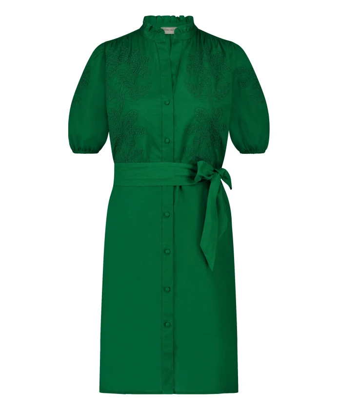 Это короткое зеленое женское платье станет настоящим украшением любого случая. Оно украшено вышитыми звездами на груди, имеет пышные рукава, высокий воротник с оборками и очаровательный пояс.