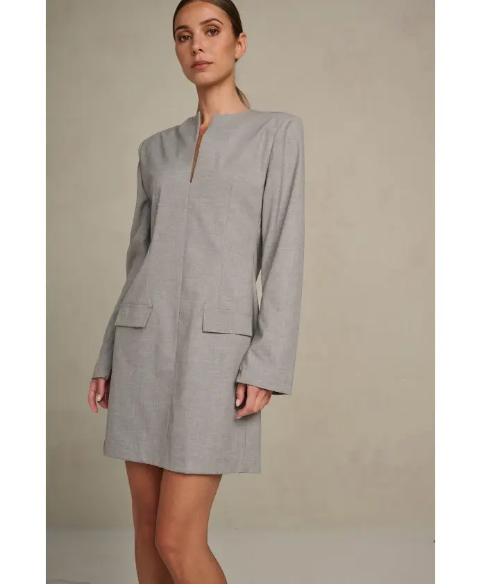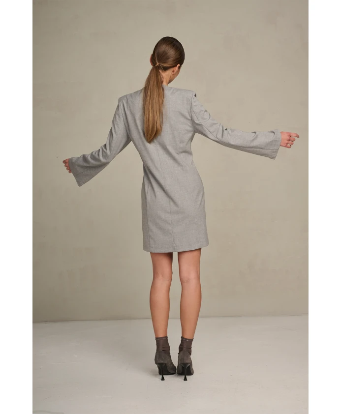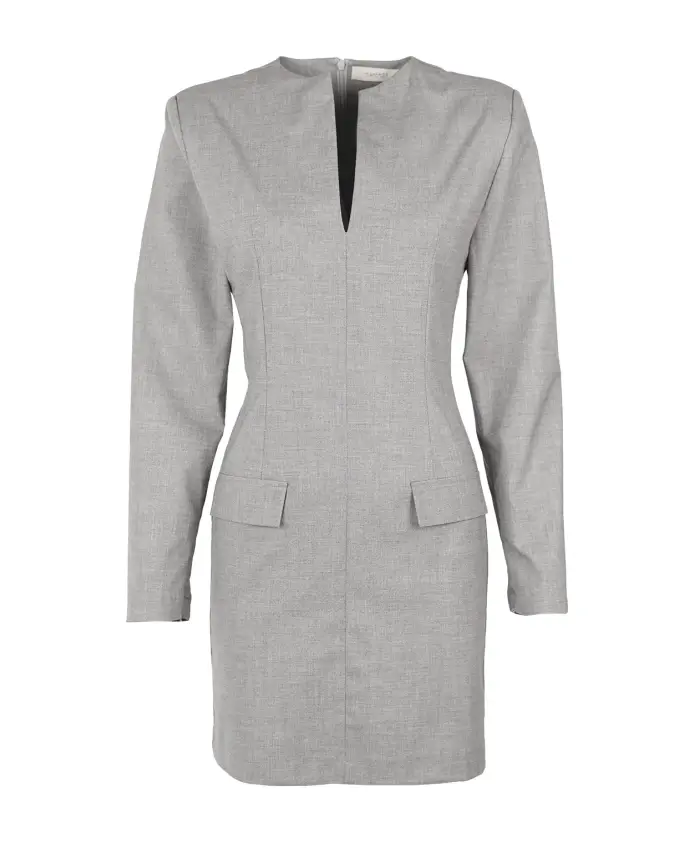 Платье Maiti сшито на заказ, имеет эффектный V-образный вырез и элегантные застежки-молнии на рукавах. Это вневременная классика, идеально подходящая для любого особого случая.