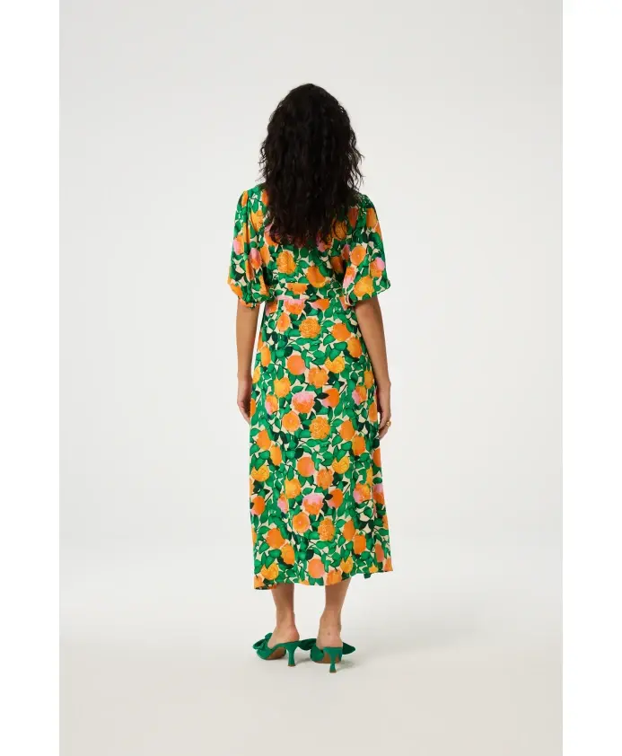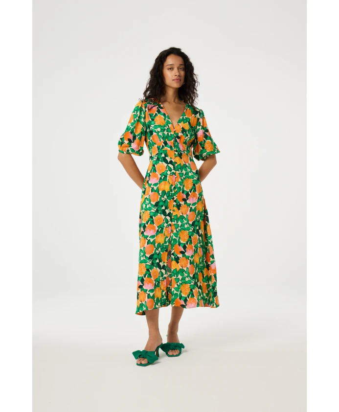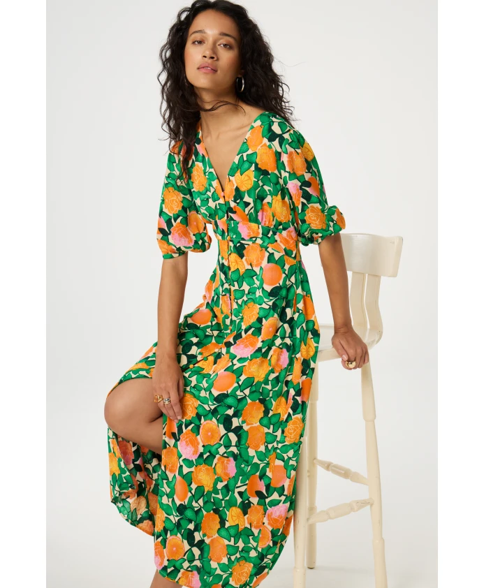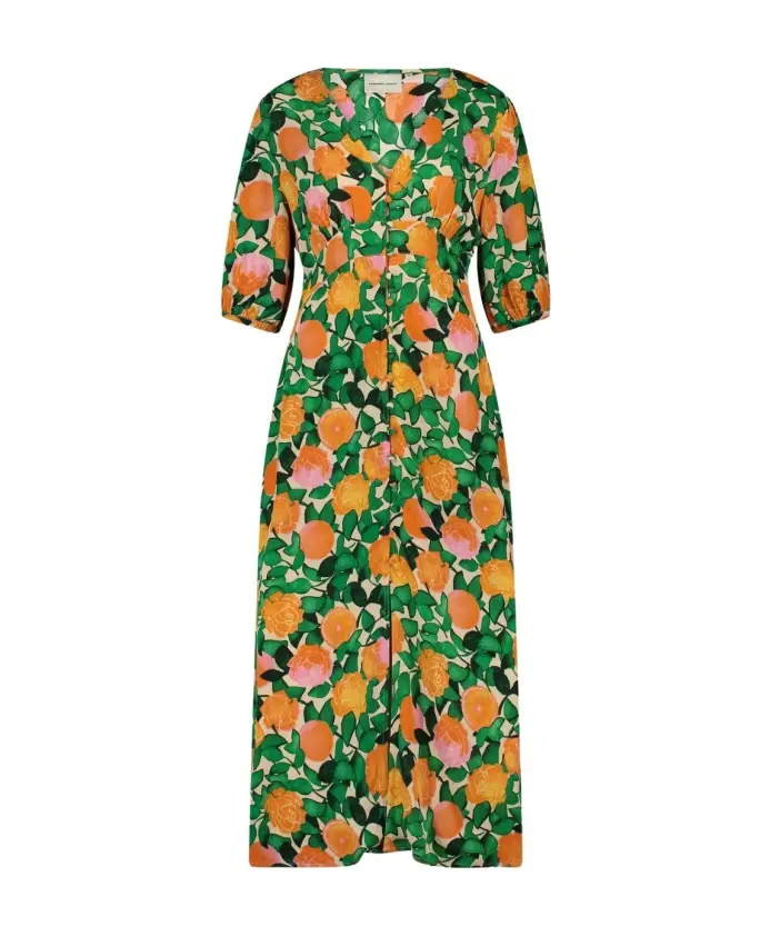 Это женское платье миди с узором из оранжевых роз имеет рукава 3/4, V-образный вырез и пуговицы, обтянутые тканью. Классическое женственное платье с интересной деталью.