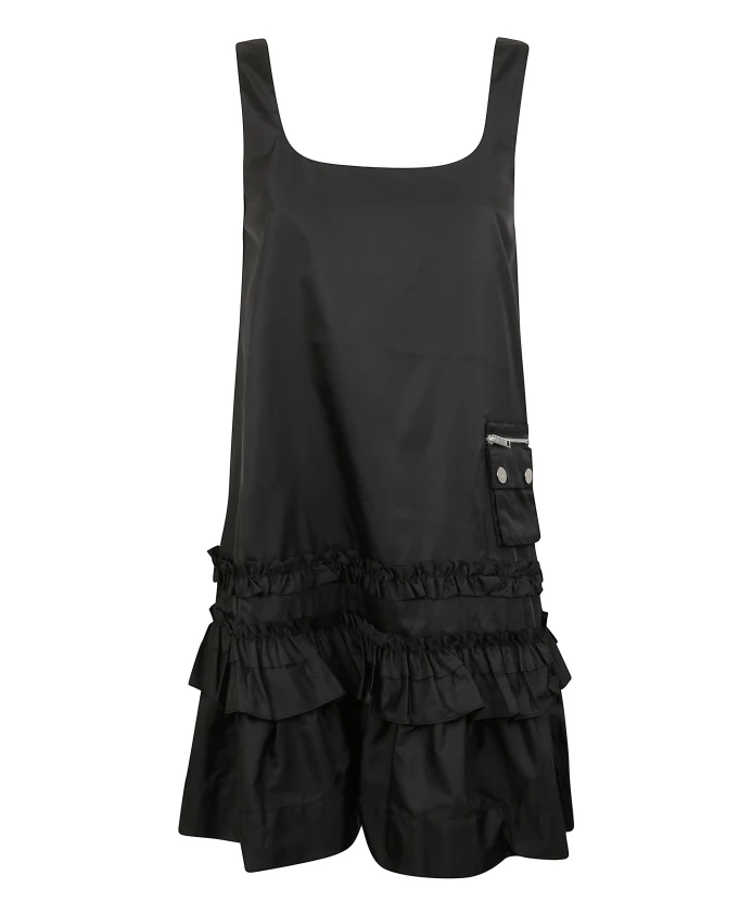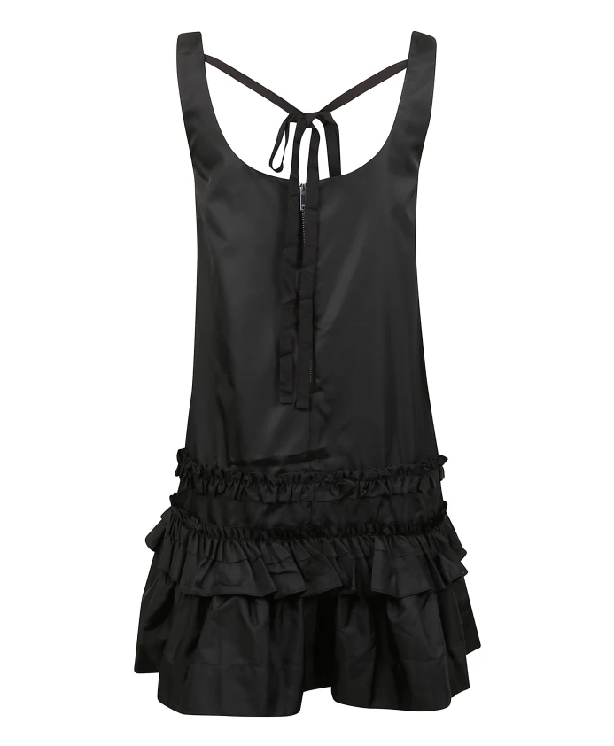 Короткое платье на тонких бретельках с присборенным вырезом. Сборки по низу, застежка сзади на черные ленты. Боковой карман на молнии и пуговицах.