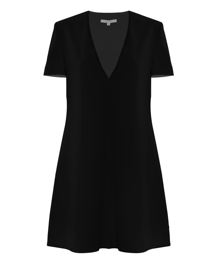 Короткое элегантное платье с V-образным вырезом и рукавами до локтя. Слегка очерченные оборки по подолу и вырезу горловины.