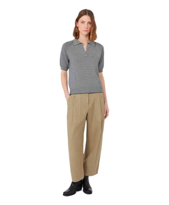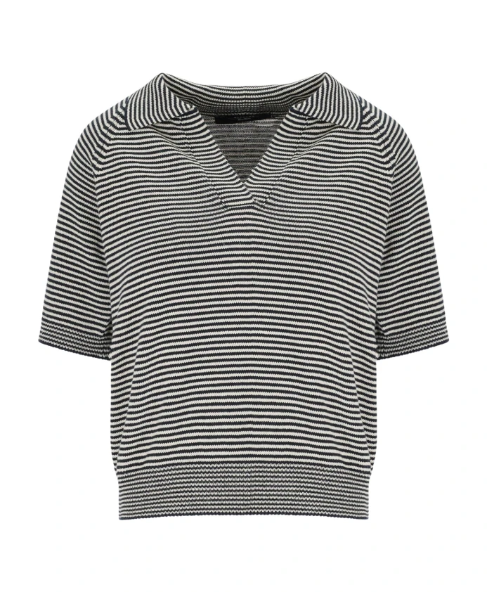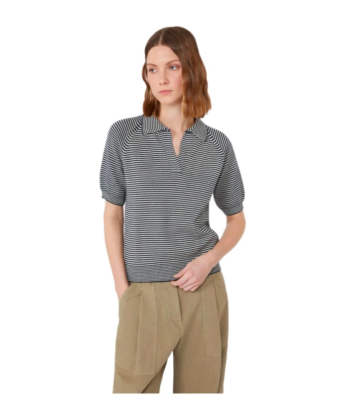 Поло Weekend Max Mara Junior из хлопка с горизонтальной сине-белой полосой. Имеет открытый воротник-поло и V-образный вырез для создания расслабленного, элегантного повседневного образа. Ключевые особенности: Синий | Белый | Хлопок | Горизонтальная полосатая расцветка | Открытый воротник-поло | V-образный вырез | Ребристые манжеты и нижний край | Размеры и посадка: Рост модели: 179 см; размер M | Стандартный крой | Состав и уход: 100% хлопок | Ручная стирка в холодной воде (макс. 40°C); не отбеливать; не сушить в сушильной машине; сушить в горизонтальном положении в тени; гладить при низкой температуре; профессиональная химчистка (перхлорэтилен, деликатный режим); не стирать влажным способом; гладить тканью; использовать нейтральное моющее средство.
