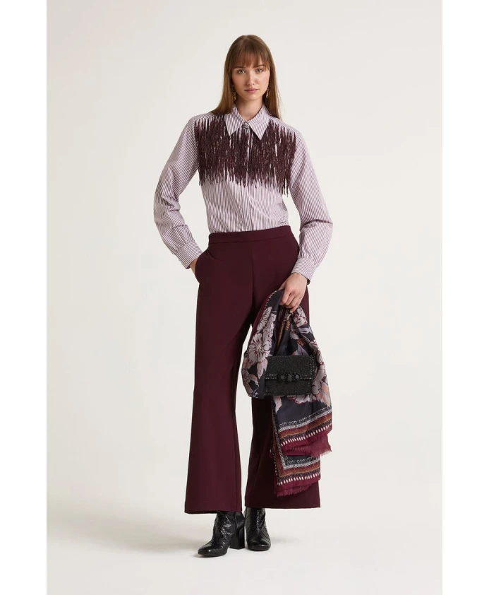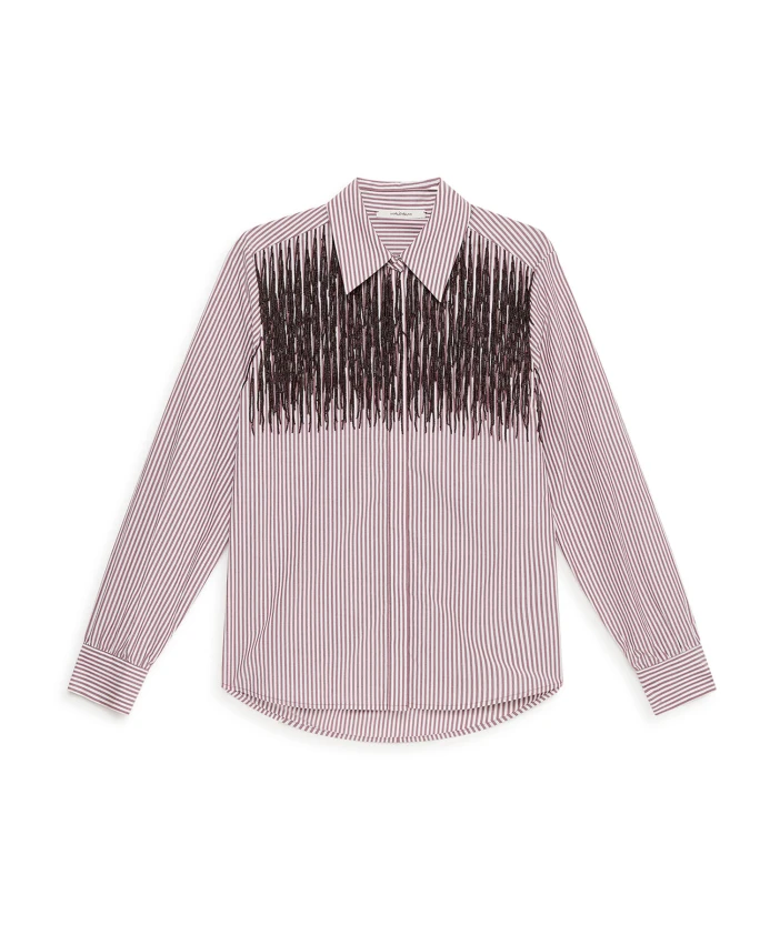 Рубашка MALIPARMI Pop Stripes изготовлена из хлопкового поплина и украшена деталями от кутюр. Она имеет бахрому и бисерную отделку, выполненные вручную, что придает классической полосатой рубашке изысканность. Основные характеристики: Бордовый | Белый | Хлопок | Бахрома и бисерная отделка, выполненные вручную | Полосатый узор | Поплин | Размеры и посадка: Длина: 70 см | Состав материала и уход: 100% хлопок | Не стирать; Химчистка (перхлорэтилен, деликатный режим) или химчистка (углеводороды, деликатный режим); Гладить при максимальной температуре 110°C; Не сушить в сушильной машине; Не отбеливать.