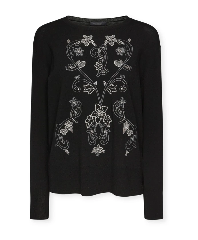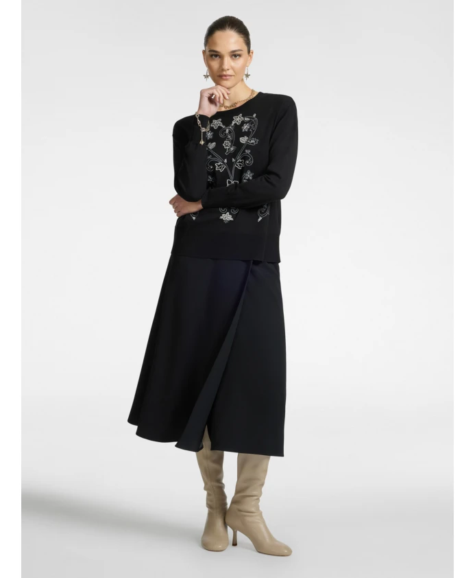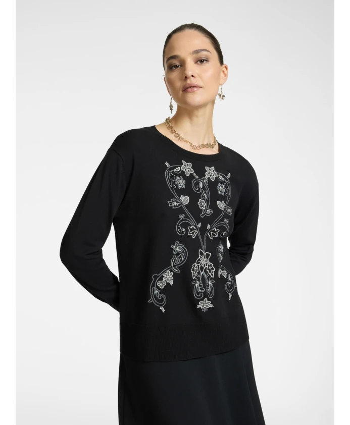 Описание товара: - Свитер с круглым вырезом из комфортной вискозы с тонкой рельефной вышивкой на передней части, выполненной из пряжи и проволоки. - Высокие манжеты с ребристыми краями и прямой крой. - Изделие, полное изысканных деталей. Состав и уход: - Основная ткань: 84% вискоза, 16% полиэстер; 2-я ткань: 69% вискоза, 15% полиамид, 13% полиэстер, 3% эластан; 3-я ткань: 83% вискоза, 15% полиэстер, 1% полиамид, 1% эластан; 4-я ткань: 100% полиэстер. - Ручная стирка; не сушить в сушильной машине; не отбеливать; сушить в горизонтальном положении; не подвергать химчистке; не гладить (макс. 110°C).