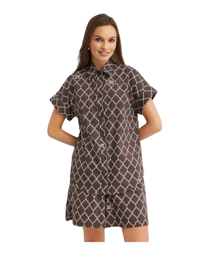 Рубашка Max Mara Sponda из легкого хлопкового поплина из пляжной коллекции бренда отличается принтом с логотипом по всей поверхности и свободным силуэтом. Она отлично подходит для элегантного повседневного стиля и летней погоды. Ключевые особенности: Коричневый | Хлопковый поплин | Легкий | Плотный поплин | Неэластичная ткань | Застежка на пуговицы | Заостренный воротник | Короткие рукава | Закругленный низ | Монограммный принт по всей поверхности | Размеры и посадка: Свободный крой | Соответствует размеру | Длина ниже бедер | Состав и уход: 100% хлопок | Машинная стирка при 30°C.
