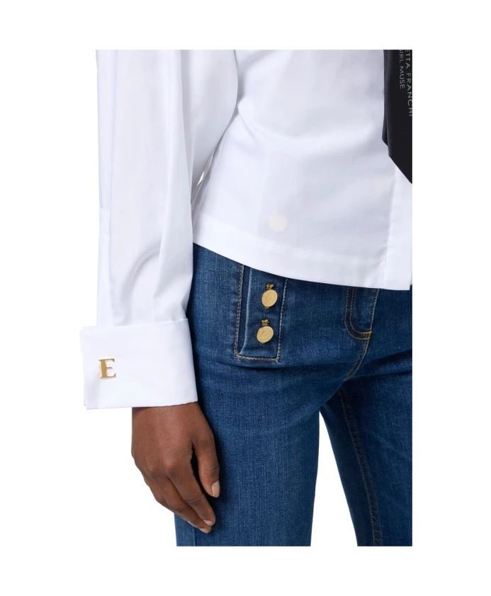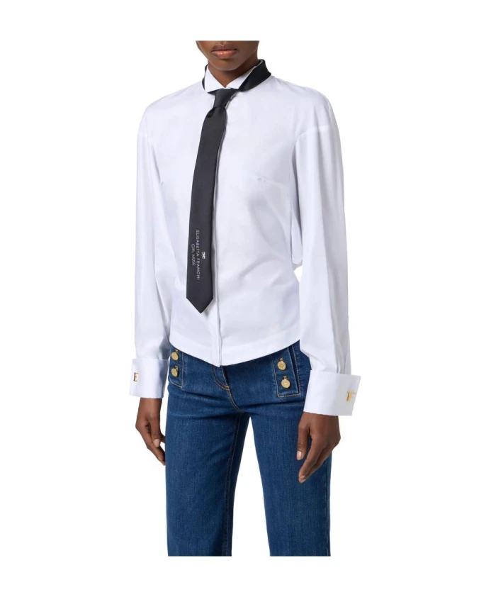 Рубашка Elisabetta Franchi из хлопкового поплина с галстуком-бабочкой - это приталенная рубашка классического кроя с воротником-стойкой и атласным галстуком-бабочкой для элегантного дневного или вечернего образа. Ключевые особенности: Белый | Черный | Хлопок | Регулируемые лямки в виде жилета сзади | Воротник-стойка | Широкие рукава | Баска | Атласный галстук-бабочка с контрастным логотипом | Манжеты с запонками | Размеры и посадка: Длина 65 см для размера IT 40 | Рост модели 177 см, размер IT 40 | Приталенный крой | Состав и уход: 100% хлопок