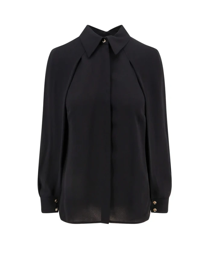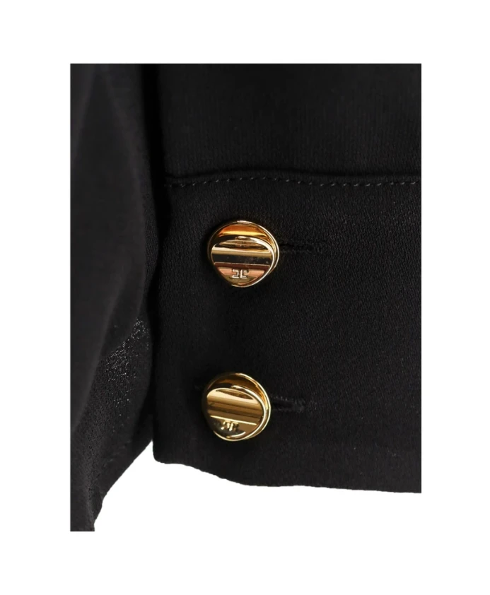 Расширьте свой гардероб этой блузкой от Elisabetta Franchi, сшитой из роскошного вискозного жоржета. Ее отличительная особенность - уникальные рукава-кейп, украшенные золотыми металлическими пуговицами с логотипом, которые добавят элегантности любому образу. Ключевые особенности: Черный | Вискоза жоржет | Съемное ожерелье через плечо с бантом | Рукава-кейп | Золотые металлические пуговицы с логотипом | Размер и посадка: Стандартный крой | Состав и уход: 100% вискоза | Только химчистка