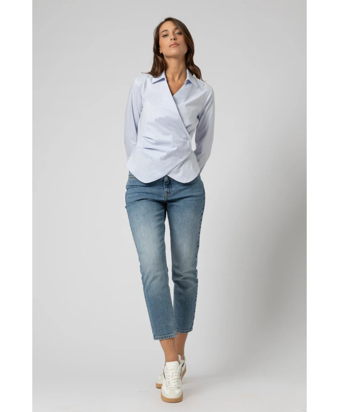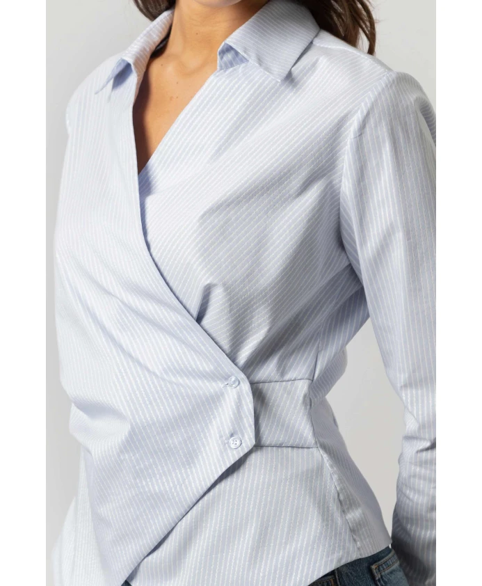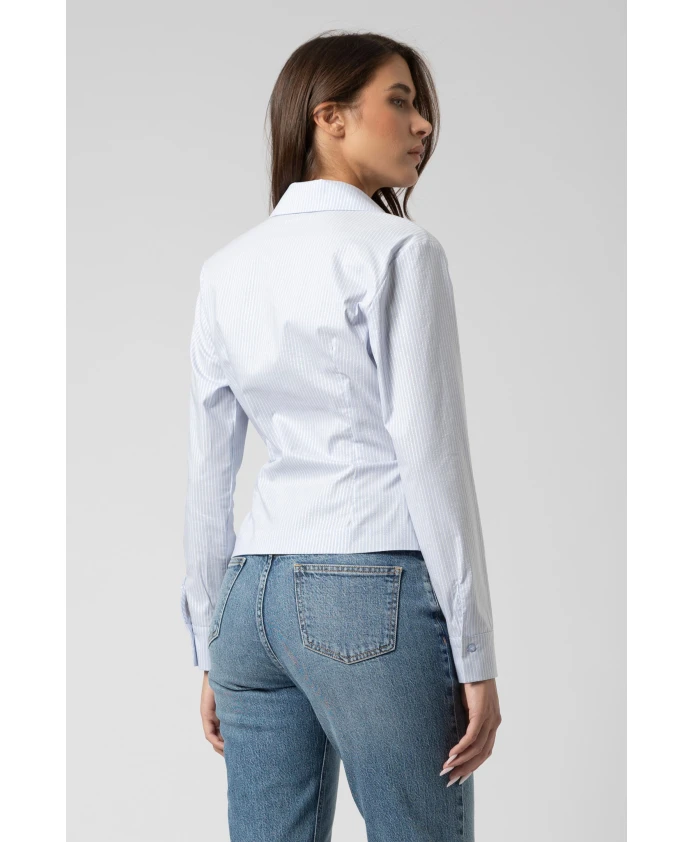 Полосатая рубашка-халат от Kocca с застежкой на пуговицы сочетает в себе тонкий полосатый узор и силуэт с запахом, создавая элегантную и универсальную блузку, подходящую как для работы, так и для повседневных образов. Ключевые особенности: Синий | Fant Panna | Cielo | Застежка-халат | Застежка на две пуговицы | Полная застежка на пуговицы | Тонкий полосатый узор | Длинные рукава | Стандартный воротник | Контурный низ | Манжеты | Размеры и посадка: Рост модели 175 см, размер S/42