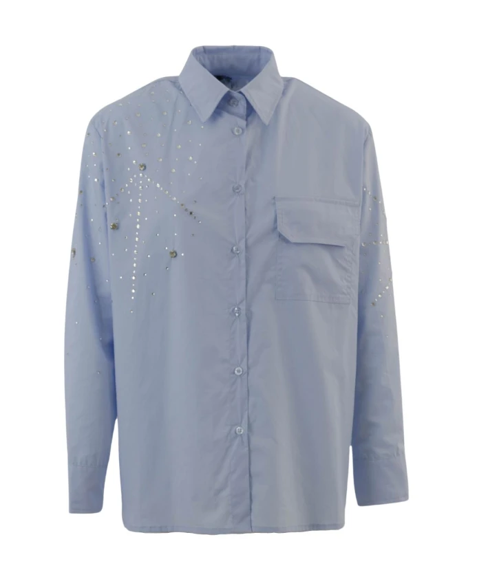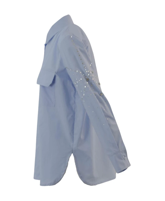 Эта уникальная рубашка оверсайз от бренда украшена сверкающими стразами на обоих рукавах и правой стороне груди, а большие боковые разрезы создают расслабленный, воздушный силуэт. Ключевые особенности: Синий | Большие боковые разрезы | Украшение стразами на обоих рукавах и правой стороне груди | Свободный силуэт | Большие боковые разрезы | Размеры и посадка: Свободный крой | Свободный силуэт