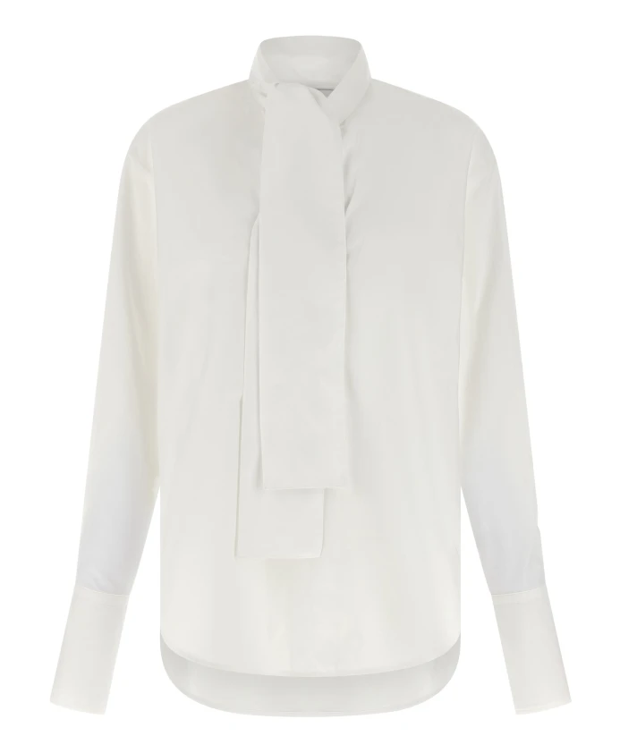 Рубашка телесного цвета с воротником-лавальером из хлопкового поплина, отличающаяся эффектным воротником-лавальером и галстуком, - это стильный и универсальный вариант. Ключевые особенности: Белый | Телесный | Хлопковый поплин | Воротник-лавальер с галстуком | V-образный вырез | Длинные рукава с манжетами | Боковые разрезы | Асимметричный низ | Состав и уход: 100% хлопок