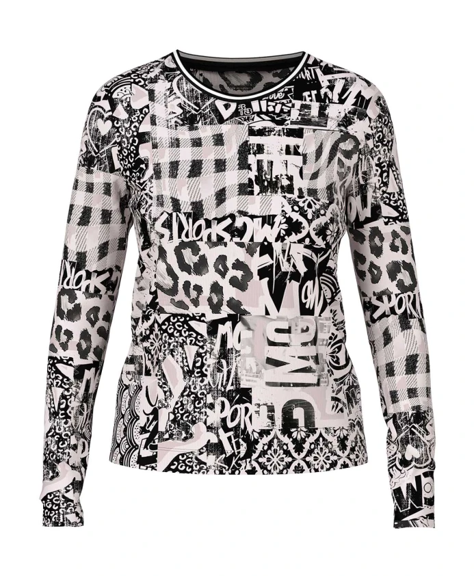 Эта рубашка с длинными рукавами от Marc Cain, изготовленная из эластичного ребристого хлопка, сочетает в себе исключительный комфорт и модный стиль. Классический круглый вырез создает вневременной силуэт, а яркий принт добавляет неповторимости. Универсальная вещь для создания стильных образов с характером.