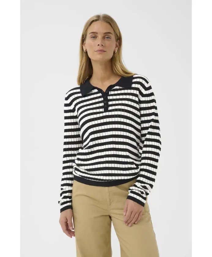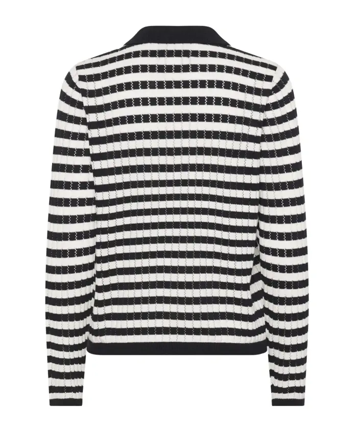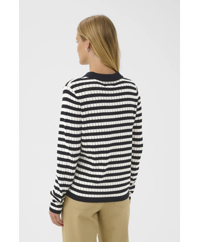 Полосатая рубашка-поло из второй части коллекции - это трикотажная рубашка-поло, сочетающая классический полосатый узор с повседневным стилем smart-casual. Создана для многослойных образов и непринужденной обстановки. Ключевые особенности: Разноцветная | Темно-синяя полоса | Круглый вырез | Полосатый узор