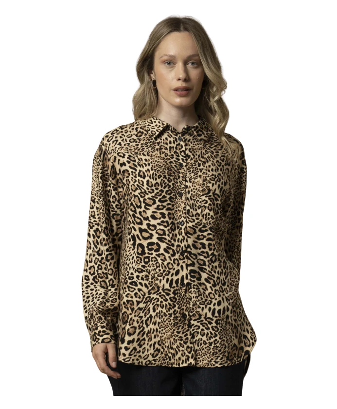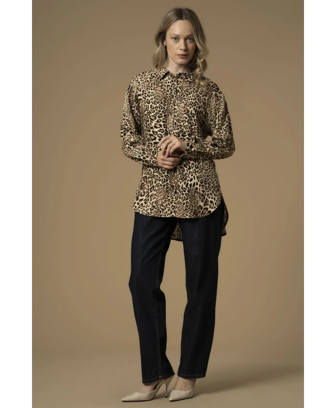 Стильная рубашка с длинными рукавами и леопардовым принтом, с центральными пуговицами в тон, свободным кроем, манжетами на пуговицах и зауженным низом с двойной строчкой. Рост модели 175 см, размер S/42.