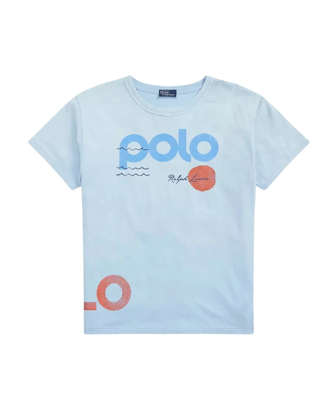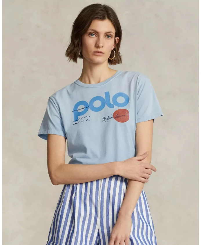 Женская футболка Polo Ralph Lauren светло-голубого цвета с красным логотипом спереди и сзади, круглый вырез, короткие рукава, прямой крой, изготовлена из 100% мягкого хлопка.
