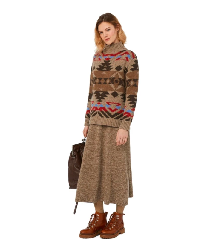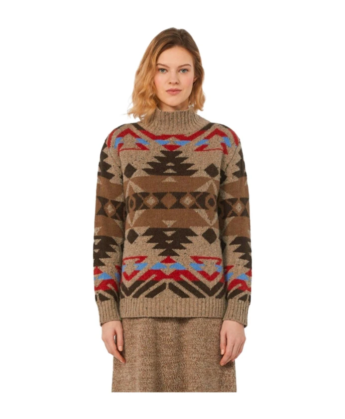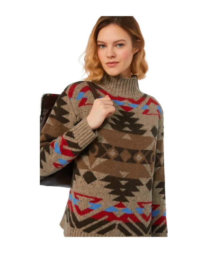 Свитер с высоким воротником Weekend Max Mara Eritrea - это вязаный свитер из шерсти и альпаки с многоцветным жаккардовым узором. Он имеет высокий воротник, ребристые манжеты и нижний край для создания теплого многослойного образа в прохладные дни. Ключевые особенности: Коричневый | Многоцветный | Шерсть и альпака | Высокий воротник | Жаккардовый узор | Ребристые манжеты и нижний край | Длинные рукава со спущенными плечами | Средняя длина | Размеры и посадка: Рост модели 176 см, размер M | Состав и уход: 33% шерсть | 27% акрил | 24% альпака | 8% полиамид | 8% вискоза | Ручная стирка в холодной воде (макс. 40°C); не отбеливать; не сушить в сушильной машине; сушить в горизонтальном положении в тени; гладить при низкой температуре; профессиональная химчистка (перхлорэтилен, деликатный режим); не стирать влажным способом; гладить тканью; использовать нейтральное моющее средство.