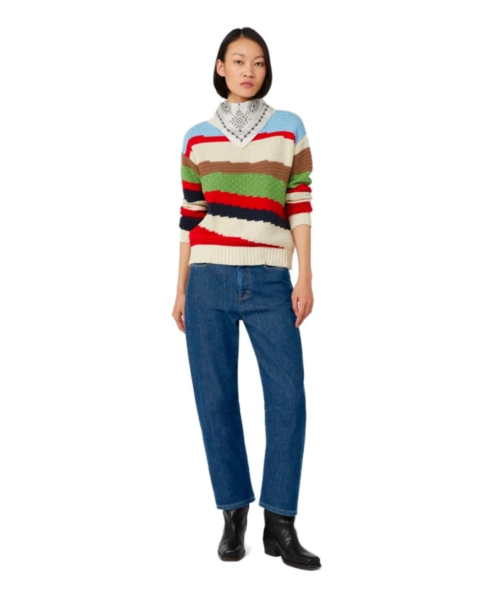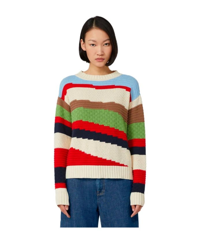Поло-свитер Weekend Max Mara сочетает в себе хлопковую смесь и асимметричный многоцветный полосатый узор. Идеально подходит для создания непринужденных многослойных образов и повседневной носки. Ключевые особенности: Многоцветный | Хлопковая смесь | Круглый вырез | Ребристый воротник, манжеты и нижний край | Длинные, приспущенные рукава | Асимметричный многоцветный горизонтальный полосатый узор | Ребристая отделка | Размеры и посадка: Стандартный крой и длина | Рост модели 178 см, размер M. | Состав и уход: 60% хлопок | 40% акрил | Ручная стирка в холодной воде (макс. 40°C); не отбеливать; не сушить в сушильной машине; сушить в горизонтальном положении в тени; гладить при низкой температуре; профессиональная химчистка (перхлорэтилен) - щадящий режим; не стирать влажным способом; гладить с прокладкой из ткани; использовать нейтральное моющее средство.