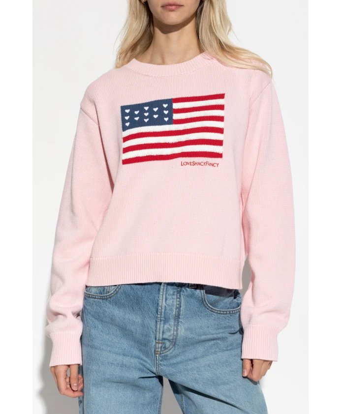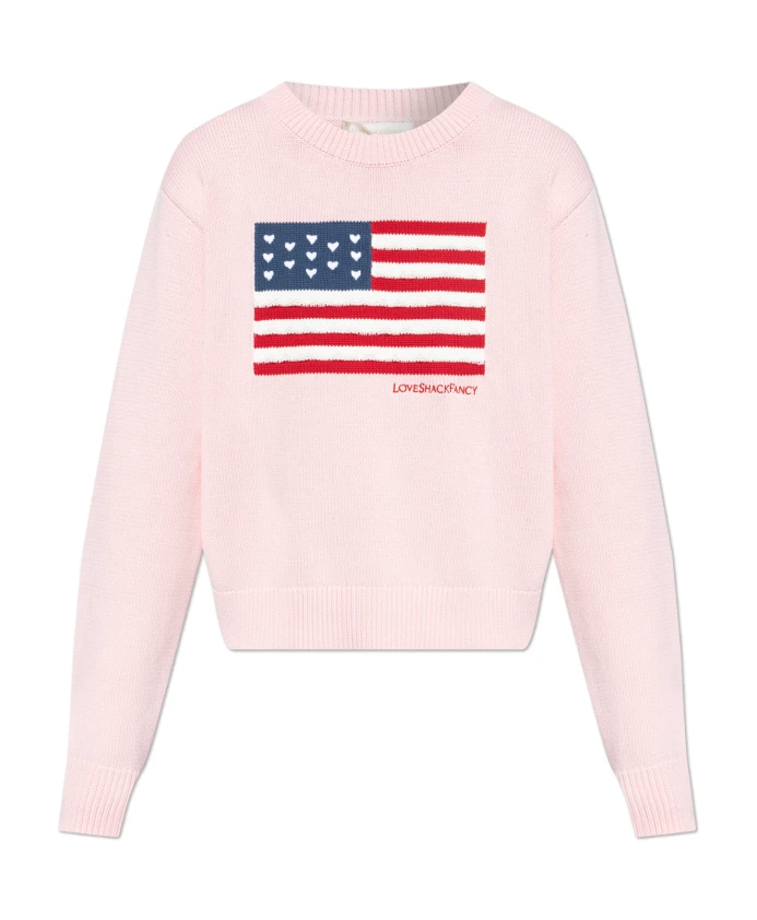 Свитер BLUSHING от LoveShackFancy - изысканный выбор для женщин, ценящих уникальный стиль и утонченную элегантность. Его простой, слегка свободный крой со спущенными плечами ненавязчиво подчеркивает силуэт и создает ощущение легкости и непринужденной утонченности. Отделка - низ, манжеты и вырез горловины - украшена более плотной ребристой окантовкой, добавляющей шика и подчеркивающей эксклюзивный характер изделия. Розовая трикотажная ткань высокого качества из хлопка радует своей мягкостью и комфортом. Уникальный тканый мотив американского флага с сердечками вместо традиционных звезд украшает переднюю часть свитера, дополненный декоративным элементом.