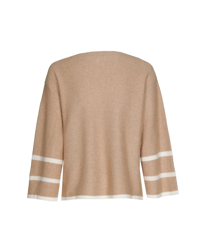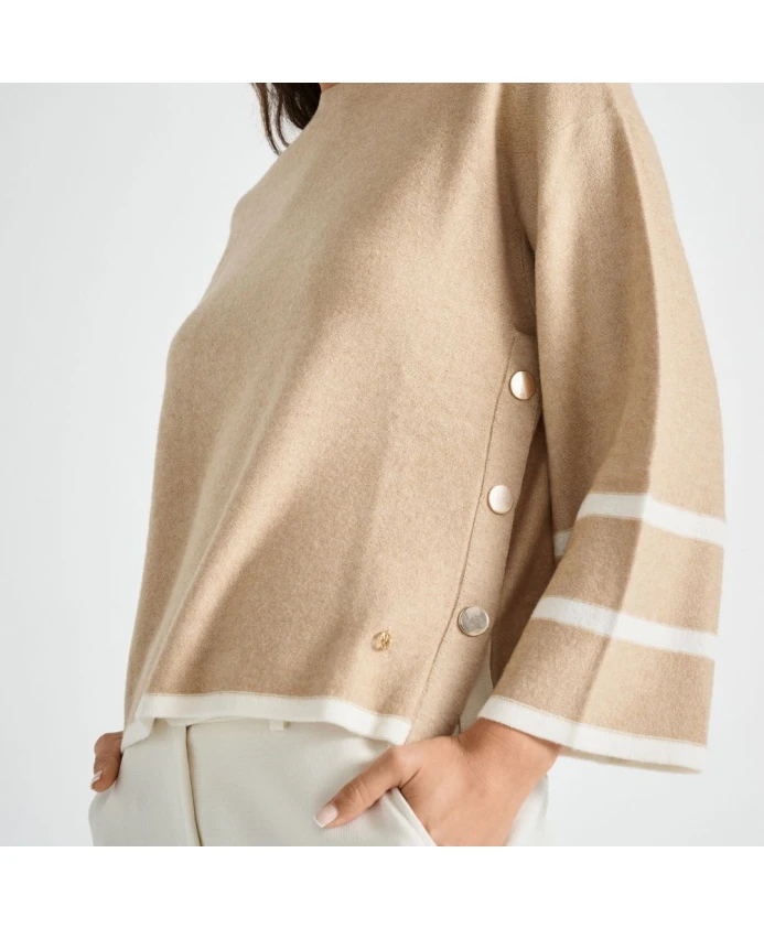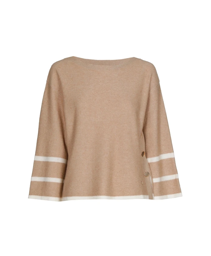 Свитер Marie Moro с круглым вырезом сочетает в себе шерсть и кашемир, полоски цвета экрю и золотистые пуговицы по бокам, создавая изысканный, но в то же время спортивный образ, который отлично сочетается как с джинсами, так и с более нарядными брюками. Ключевые особенности: Ореховый | Кремовый | Шерсть и кашемир | Круглый вырез | Полоски цвета экрю по низу и на рукавах | Золотистые пуговицы по бокам | Длинные рукава | Состав и уход: 47% шерсть, 5% кашемир, 38% вискоза, 10% полиамид | Ручная стирка при 30°C. Не отбеливать. Гладить при низкой температуре (110°C). Профессиональная химчистка (P). Сушить в горизонтальном положении.