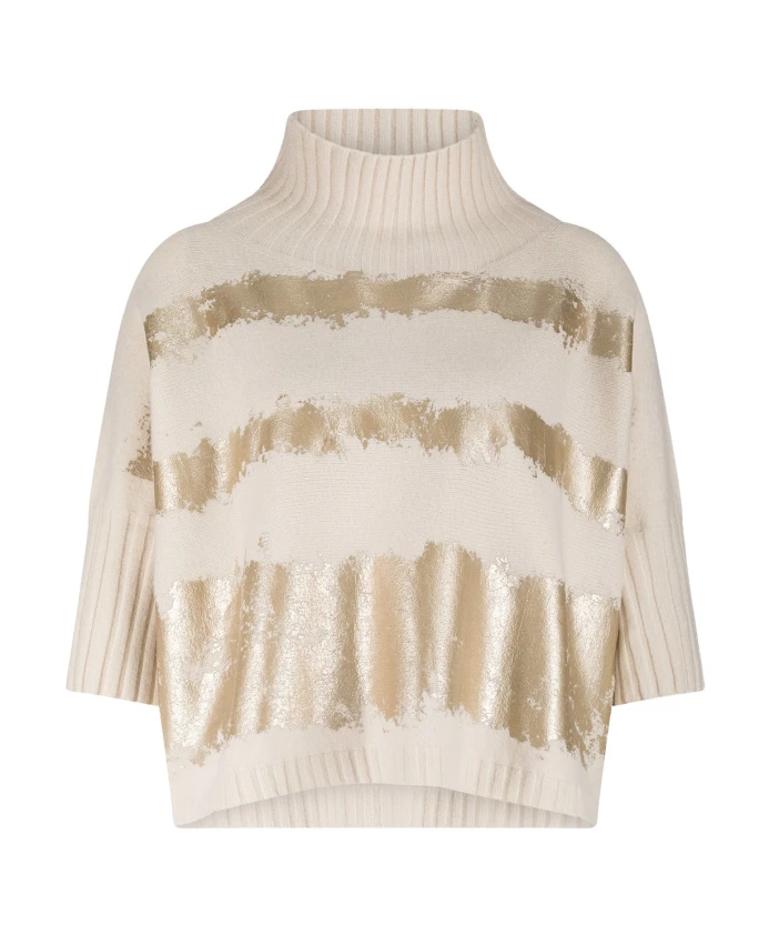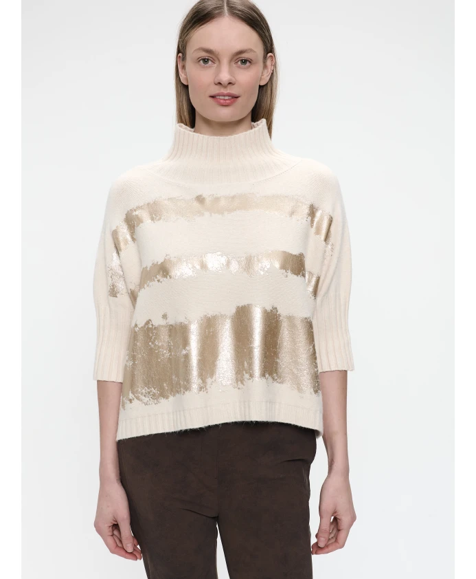 Свитер Jane Lushka с золотым принтом - это вязаный свитер свободного кроя с широким воротником-стойкой и эффектными золотыми полосами спереди. Он создан для того, чтобы дополнить как повседневные, так и нарядные многослойные образы. Ключевые особенности: Бежевый | Бежевое золото | Вязаный | Мягкий на ощупь | Удобный в носке | Легко сочетается с другими вещами | Универсальный стиль для повседневных и нарядных образов | Высокий воротник-стойка | Рукава до локтя | Свободный силуэт | Эффектный золотой принт спереди | Размеры и посадка: Соответствует размеру | Свободный, объемный крой | Длина до бедра | Рост модели 175 см, размер S