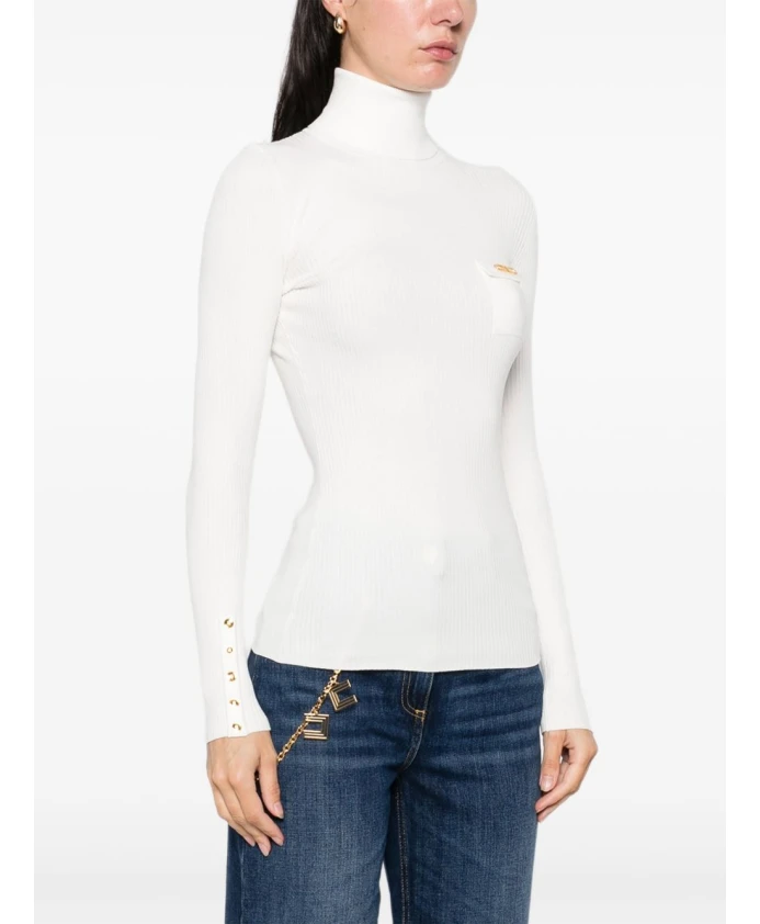 Рваный свитер с высоким воротником от Elisabetta Franchi сочетает в себе изысканный ребристый воротник, манжеты на пуговицах и металлический логотип, создавая элегантный и практичный образ. Идеально подходит для многослойных и стильных повседневных нарядов. Ключевые особенности: Белый | Вискоза | Манжеты на пуговицах | Воротник-стойка | Ребристая текстура | Длинные рукава | Атласный карман с эффектом обманчивой перспективы и металлическим логотипом | Золотистый логотип | Размеры и посадка: Приталенный крой | Состав ткани и уход: 64% вискоза | 20% полиамид | 16% шелк