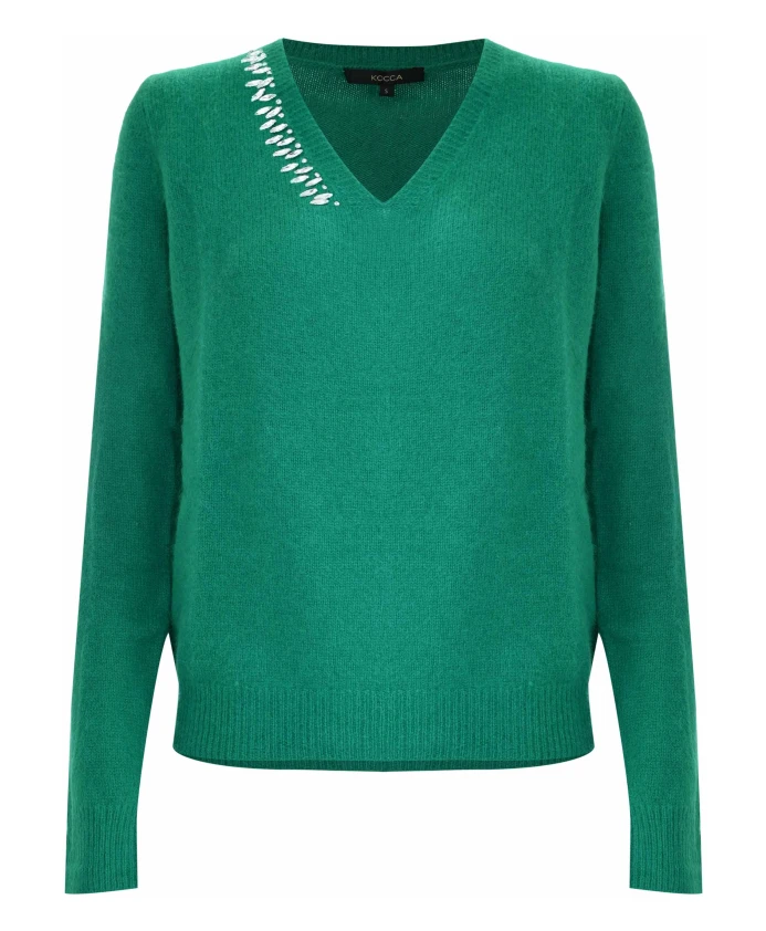 Свитер Kocca BLAKYS - это легкий вязаный пуловер с V-образным вырезом, украшенный каплевидными стразами на правом вырезе горловины. Он сочетает в себе нежную ребристую текстуру и обработанные двойным швом края, создавая изысканный и непринужденный образ. Ключевые особенности: Зеленый | Бирюзовый | Тропический зеленый | V-образный вырез | Каплевидные стразы на правом вырезе горловины | Двойной шов и обработанные ребристые края | Легкая ребристая текстура | Тонкая трикотажная конструкция | Размеры и посадка: Рост модели 175 см, размер S/42