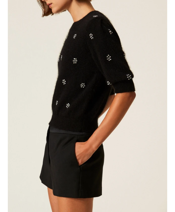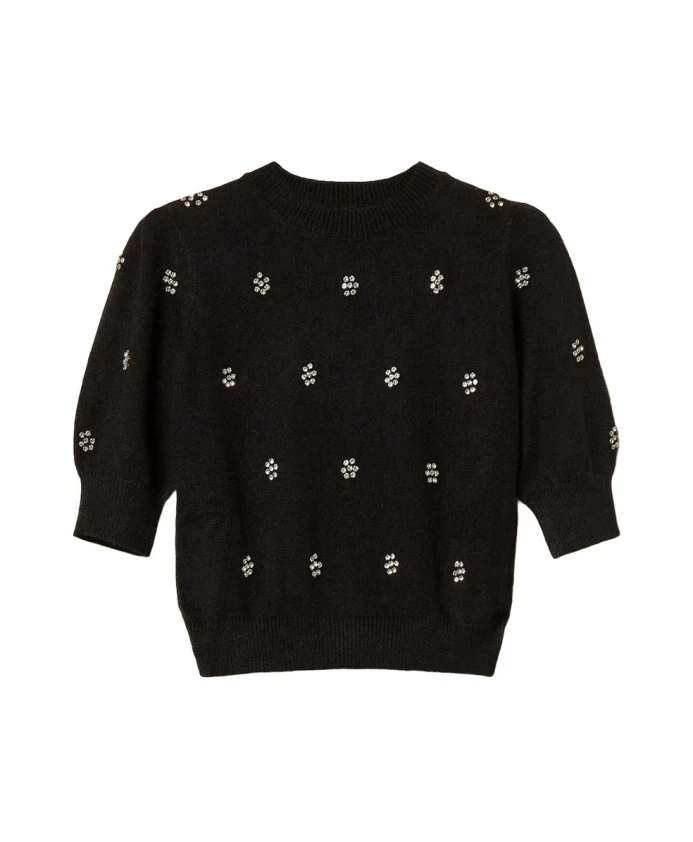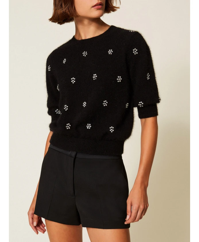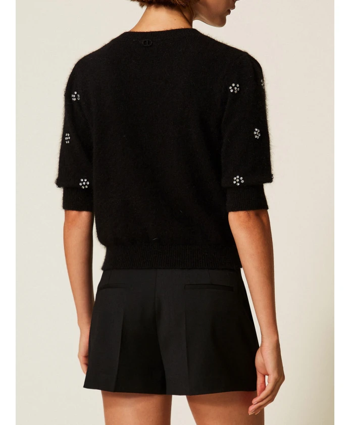 Этот комплект из двух свитеров из смеси ангоры сочетает в себе мягкую текстуру и декоративную цветочную аппликацию, создавая изысканный и комфортный трикотаж. Дизайн отличается четкими деталями и цветочными мотивами с заклепками. Ключевые особенности: Черный | Смесь ангоры | Мягкий на ощупь | Комфортный | Круглый вырез | Короткие рукава | Четкие детали | Цветочная аппликация с заклепками | Овальная Т-образная нашивка на спине | Мягкий крой для комфортного силуэта | Состав и уход: 70% полиамид | 30% ангора | Ручная стирка; сушить в тени.