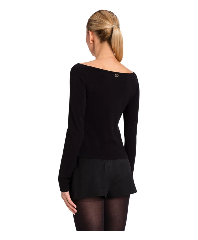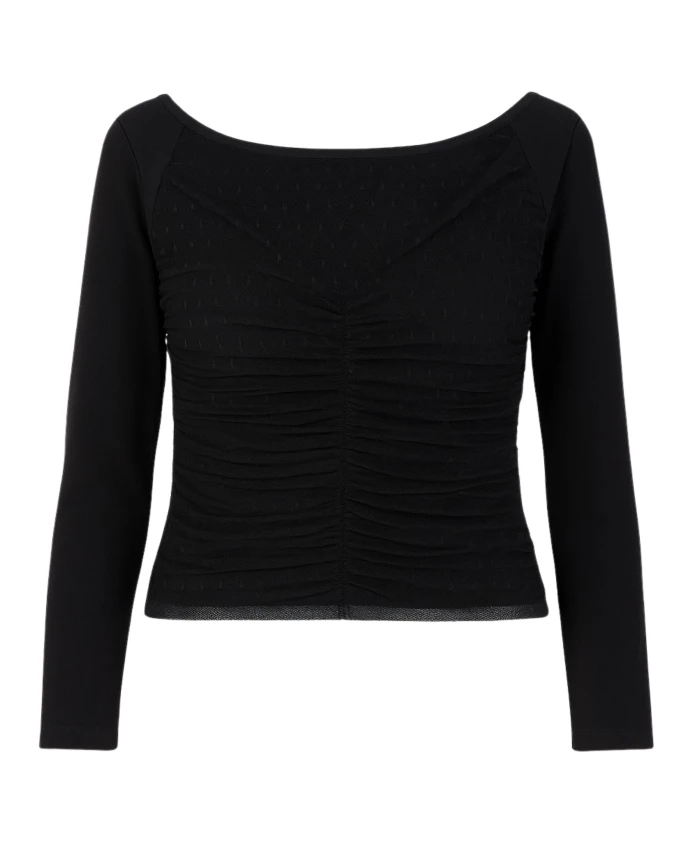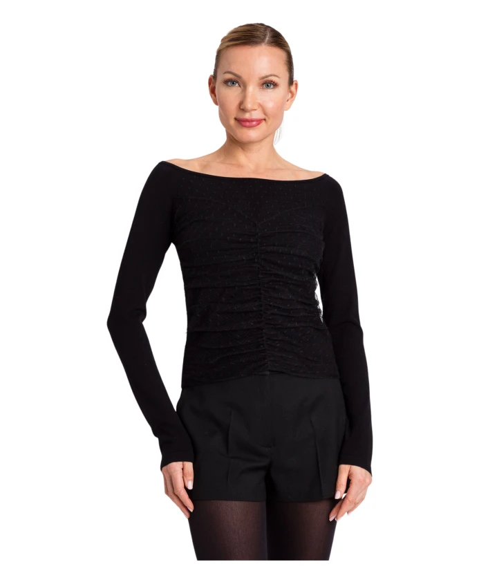 Подчеркните свой стиль с помощью этого черного топа от Twinset с широким вырезом и облегающим силуэтом, который выгодно выделяет вашу фигуру. Топ украшен центральной драпировкой и фактурной тканью в тон, что добавляет глубины и женственности дизайну. Гладкие длинные рукава создают элегантный контраст с центральной панелью. Бренд: Twinset Посадка: Облегающая Вырез: Широкий Рукава: Длинные Детали: Драпированный лиф, фактурная ткань, контраст гладкой ткани и рукавов. Состав ткани: 59% вискоза, 23% полиэстер, 16% полиамид, 2% эластан.