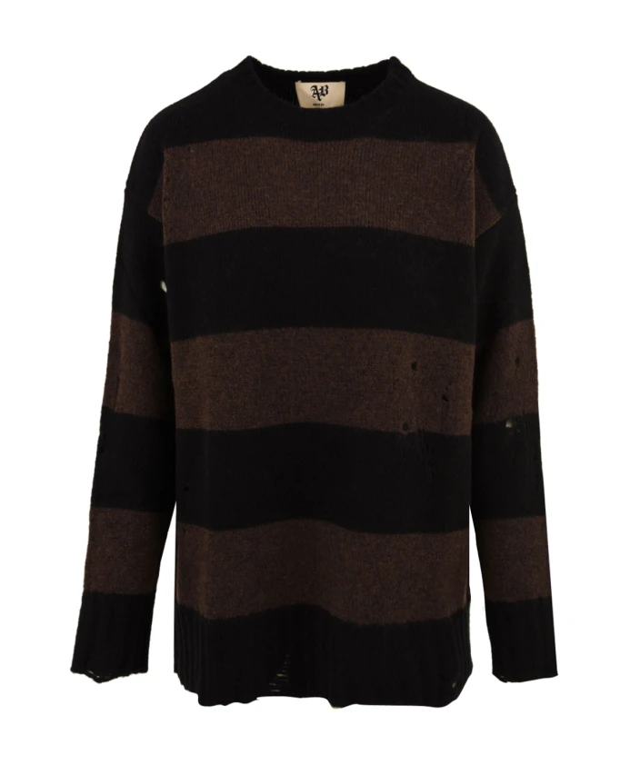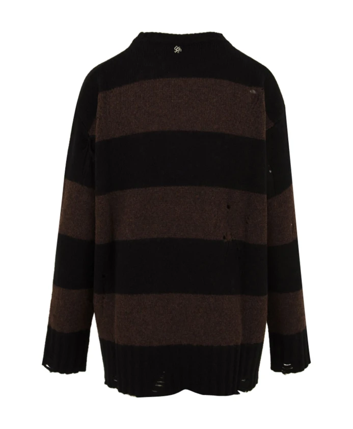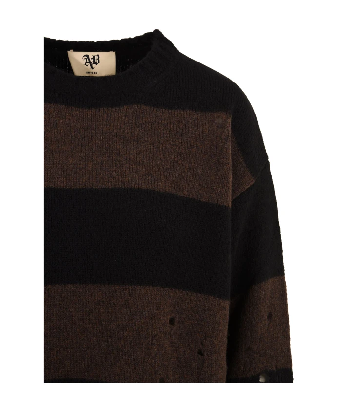 Свитер Aniye By Aly переосмысливает классический полосатый трикотаж, добавляя эффект потертости для смелого повседневного образа. Идеально подходит для повседневных нарядов, требующих современного акцентного элемента. Ключевые особенности: Коричневый | Черный мока | Шерсть | Полосатый узор | Эффект потертости | Круглый вырез | Длинные рукава | Ребристые края | Металлический логотип «AB» на спине | Размеры и посадка: Свободный крой | Состав ткани и уход: 75% шерсть, 25% полиамид