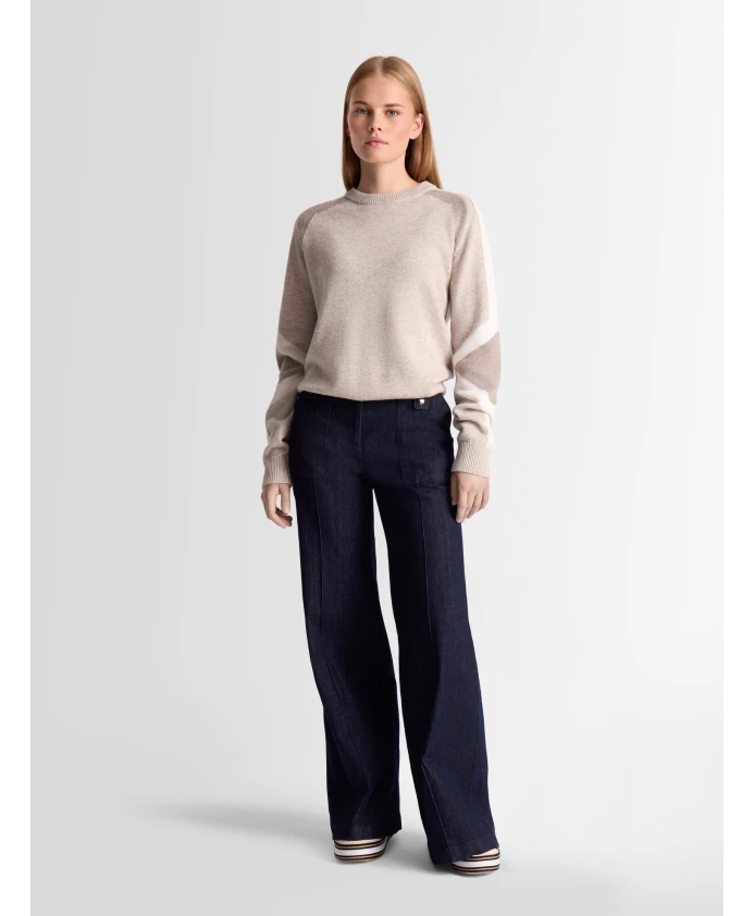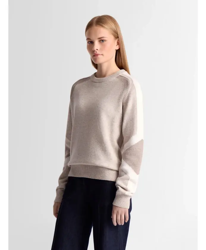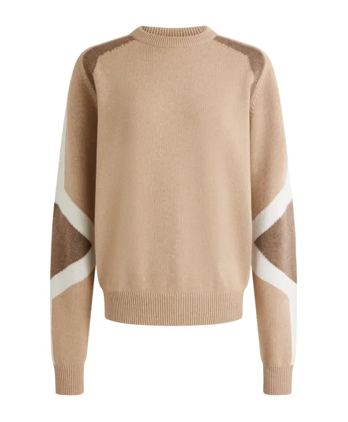 Свитер Rivena, изготовленный из шерсти и кашемира, сочетает в себе мягкость и легкость, обеспечивая комфорт в любое время года. Его трикотаж средней плотности делает его универсальным элементом гардероба, дополненным цветовым блоком на рукавах и локтях. Вдохновленный культовым горнолыжным костюмом Clarisse, этот свитер с круглым вырезом и длинными рукавами добавит современный, графический акцент в гардероб любой женщины.