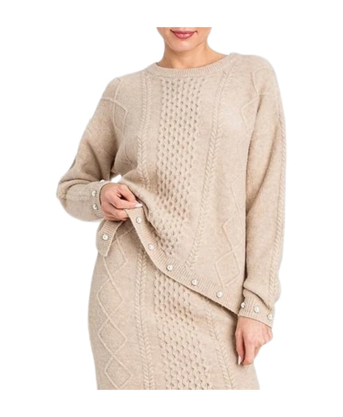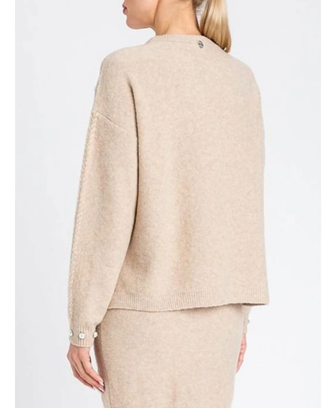 Свитер ACTITUDE с круглым вырезом сочетает в себе изысканные ребристые детали и жемчужную отделку, создавая элегантный и универсальный трикотаж, идеально подходящий как для дня, так и для вечера. Ключевые особенности: Бежевый цвет | Боковые разрезы | Круглый вырез | Длинные рукава | Ребристый воротник, манжеты и нижний край | Жемчужная отделка на манжетах и нижнем крае | Металлическая логотипная нашивка на спине